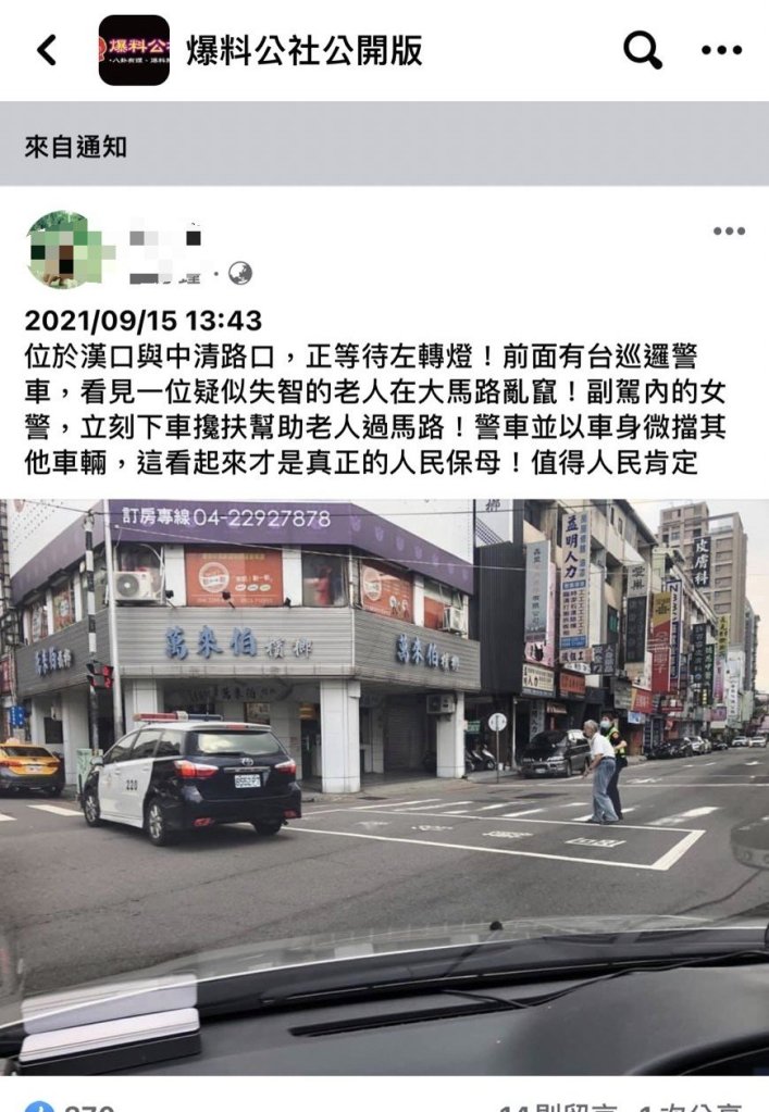 臉書社團「爆料公社」上一名網友PO文並附上照片分享,於日前15日下午13時45分許開車經過北區中清路與漢口路口,看見員警以警車擋住來車,一名女警急忙下車攙扶老翁過馬路,並稱許這看起來才是「真正的人民保母」,值得人民肯定!該則貼文收到兩千多位網友按讚勉勵,網友紛紛留言「畫面很溫馨」、「給100分」、「清流,希望帶動警察效法」,肯定員警為民服務暖心舉動。