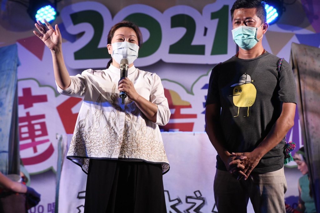 縣長徐榛蔚昨晚在文化局長吳勁毅的陪同下,前往花蓮市美崙田徑場一同與家長孩子們欣賞劇團高水準表演,現場人聲鼎沸、絡繹不絕,並且遵守防疫規範。