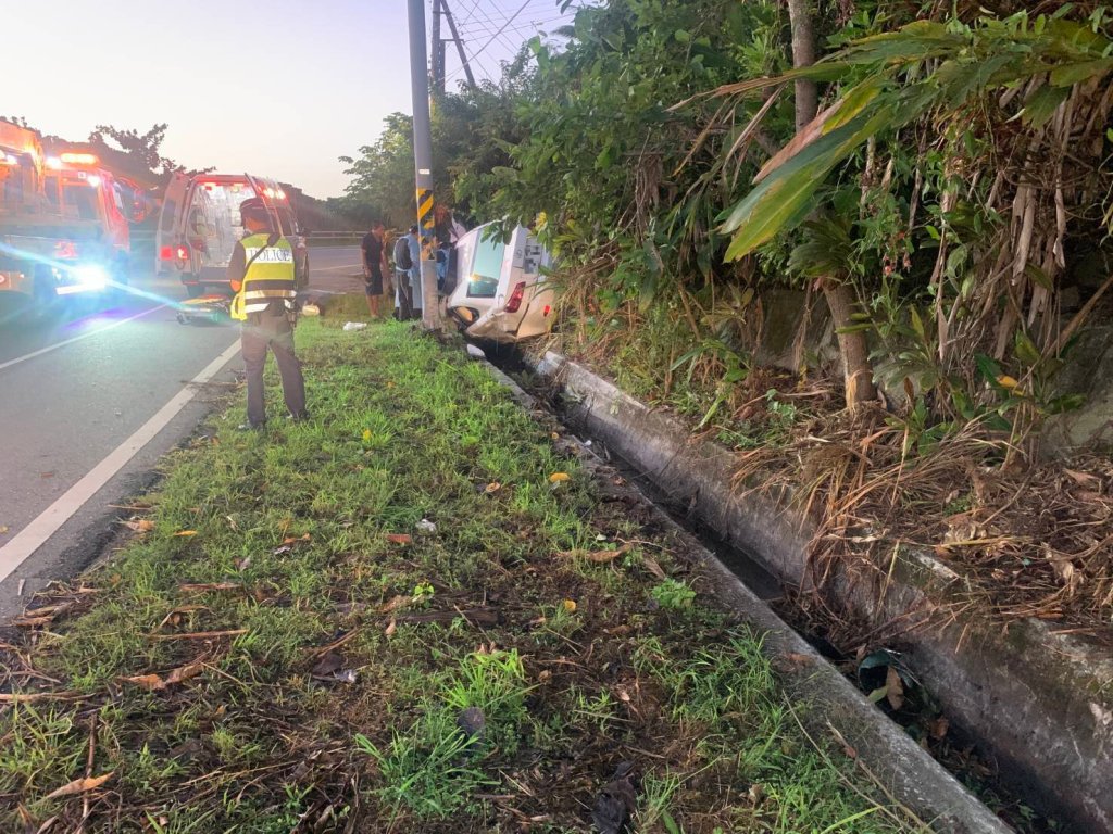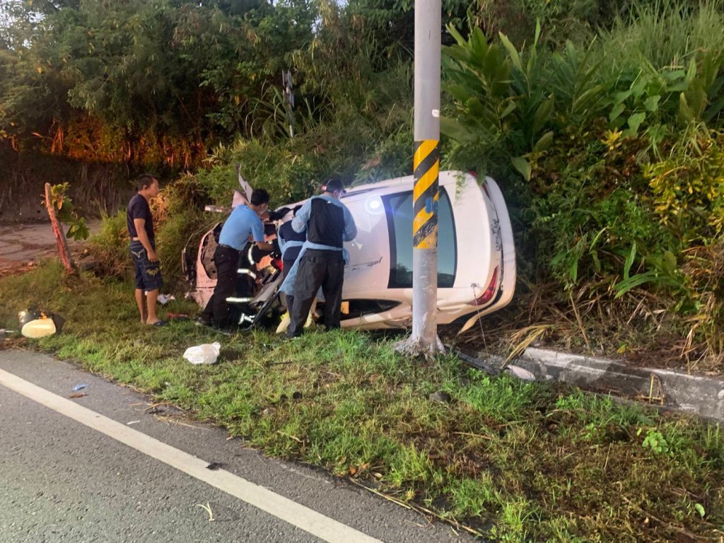 今(4)日清晨4時30分許於長濱鄉臺11線94.8公里(白桑安段)處發生自小客車自撞交通事故。經了解王姓男子(33歲)鴐駛自小客車自花蓮返臺東市路程中不慎轉彎失控,駛出路外撞擊路邊標誌桿。所幸王男與其妻2人經成功消防大隊移除車頂救出脫困,身體多處外傷,送醫治療均無生命危險。王男經抽血檢測無酒駕情事,肇事原因本分局刻正調查釐清當中。