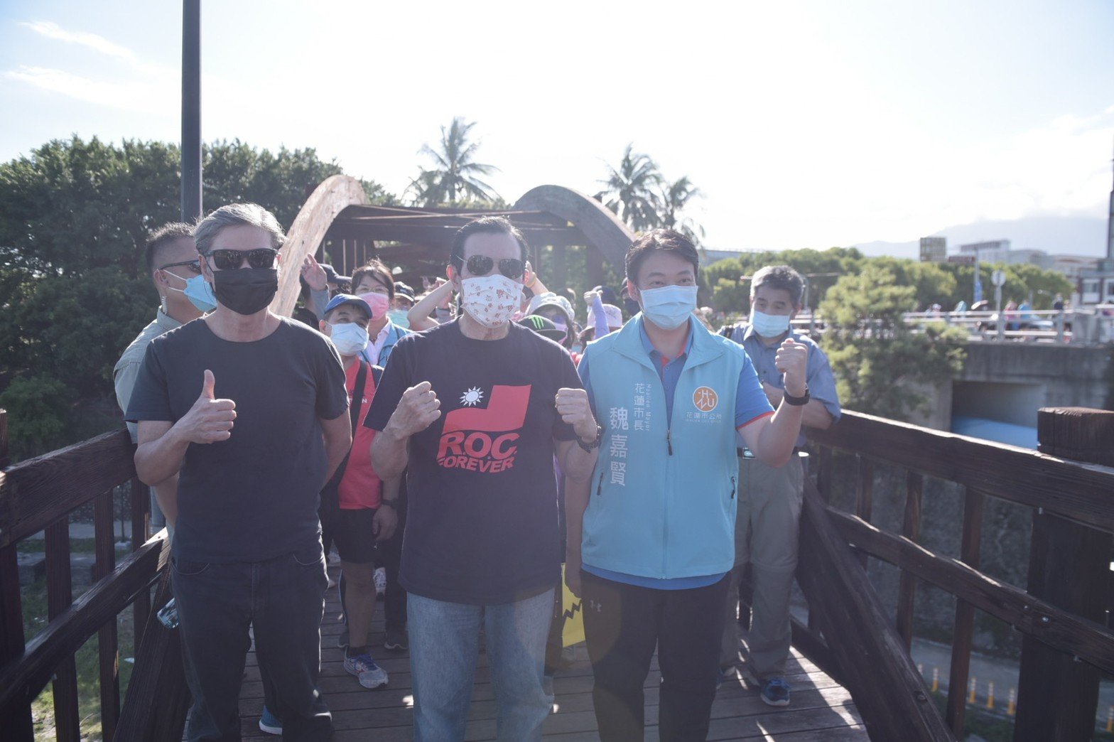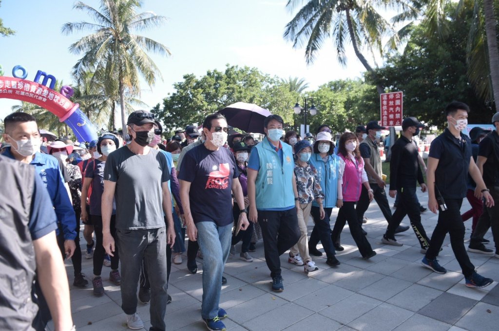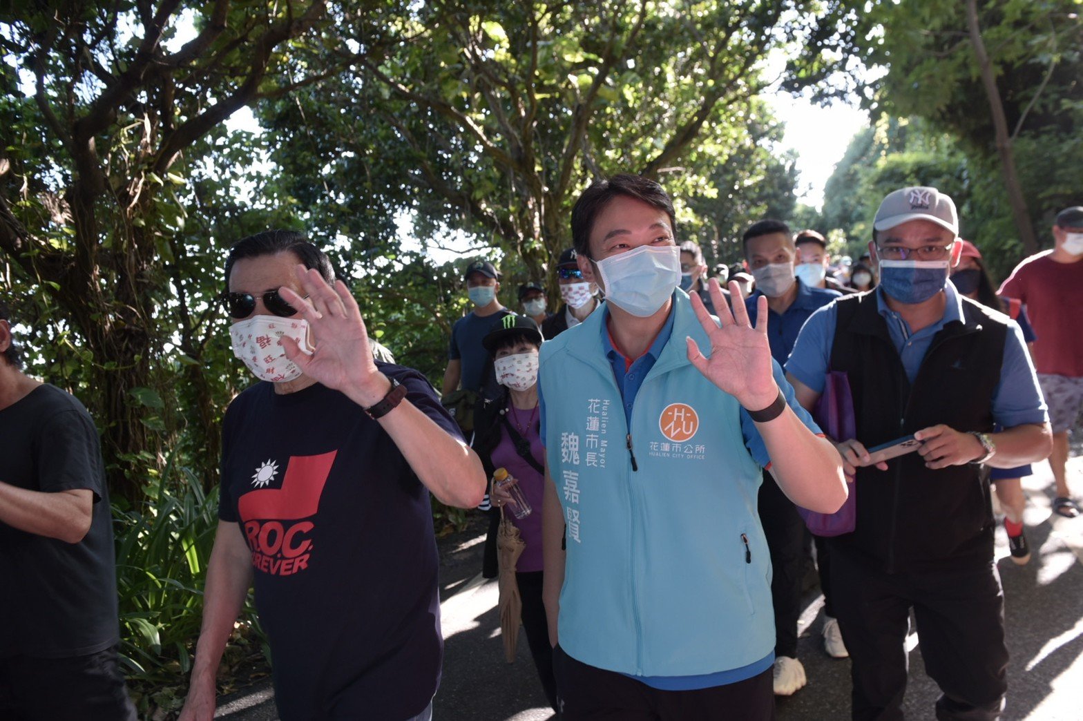 花蓮市公所舉「2021 環抱幸福、健康齊步走暨珍惜資源愛地球活動」,昨(16)日在太平洋公園曙光廣場登場,花蓮市長魏嘉賢率領市公所團隊與花蓮鄉親一起來健走運動,前總統馬英九、新台灣人文教基金會董事長金溥聰也來到現場,用行動支持花蓮,共享健走的樂趣。