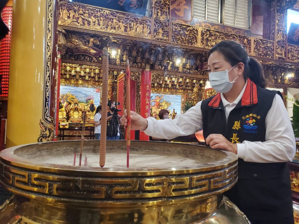 110年寺廟參拜祈福活動邁入第三日,花蓮縣長徐榛蔚今(27)日在副縣長顏新章、秘書長張逸華及各局處首長陪同下前往光復、瑞穗、玉里及富里等16座宮廟參拜祈福,並虔誠禮敬眾神明,祈求上蒼庇祐花蓮縣運昌隆、百姓安居樂業,遠離病毒侵擾。