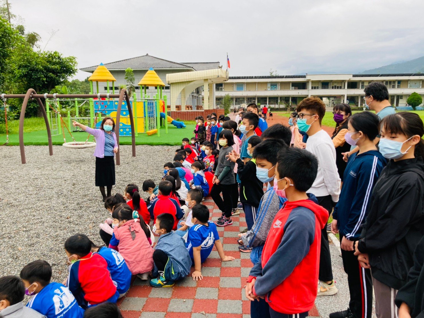 隨後請彭主任進行設施安全宣導,仔細說明遊樂設施的安全使用方法,提醒學生安全遊樂器材的使用方法,如:「玩鞦韆時不應站在鞦韆前後,也不能幫忙同學推鞦韆,以免閃避不及,遭受撞擊造成受傷」、「攀爬架使用人數規定」,以及「搖搖馬正確使用方式為坐著使用」等,每項新建的遊樂設施都鉅細靡遺地叮囑著學生們,甚至是在現場示範給學生看,讓學生能更加理解安全的重要性。