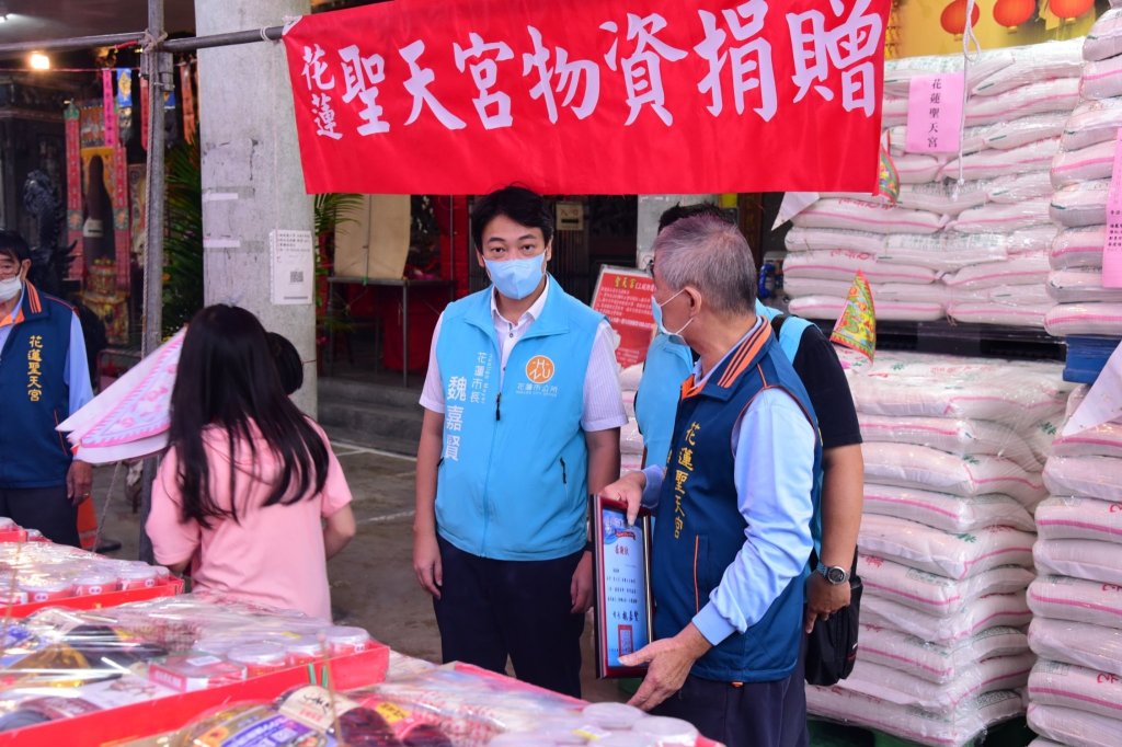 花蓮市聖天宮與花蓮市公所開辦實物銀行,關切弱勢家庭,特地捐贈建宮75周年暨消災祈福求財法會的100份民生物資及2100公斤白米給花蓮市公所愛花蓮實物銀行。市長魏嘉賢頒發感謝狀,他說,聖天宮闡揚關聖帝君義勇精神,並延伸至對弱勢的關懷以發揮慈悲大愛,期盼有更多善心人士投入社會公益的行列。
