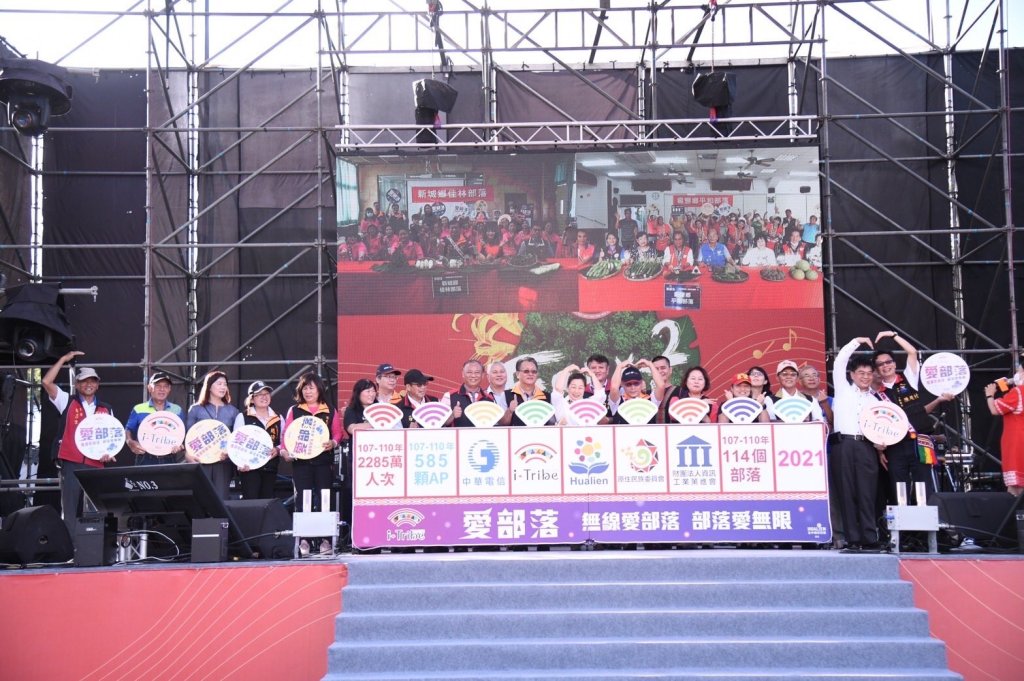 此外,活動中進行愛部落i-Tribe WiFi啟動儀式,分享花蓮縣推動部落免費WiFi計畫成果,服務零時差、無距離。縣長徐榛蔚與眾貴賓現場同步與新城鄉佳林部落及壽豐鄉平和部落進行視訊連線。利用網路無遠弗屆的特性,讓部落長輩、小朋友們隨時隨地享受網路帶來的便利,大幅縮短了城鄉數位的差距。有了免費網路服務,族人在部落能隨時上網行銷、販賣農產品,遊客到部落遊玩「打卡」,也能大幅增加曝光機會,帶動原鄉整體經濟產業發展。