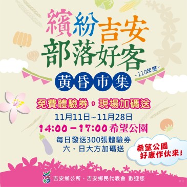 記者 謝廷瑋/吉安報導 雙11購物節吉安鄉不缺席!眾所期待的「繽紛吉安.部落好客黃昏市集」11日起14時〜17 … More 眾所期待的 繽紛吉安.部落好客黃昏市集 11日大家作伙來