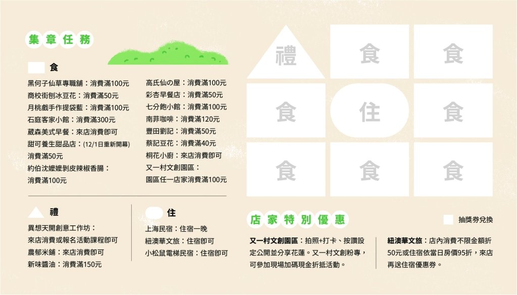 合作故事地圖店家包括,有豐田劉記、七分飽小館、石庭客家小館、桐花小廚、約伯沈嬤嬤剝皮辣椒香腸、甜可養生甜品店、彩杏早餐店、商校街刨冰豆花、南菲咖啡館、黑何子仙草專職鋪、高氏仙の屋、葳森早午餐、蔡記豆花、農郁米舖、月桃戲、新味醬油、翼想天開、上海時光民宿、小松鼠烘焙民宿、紐澳華文旅、以及又一村9間店家,共29間店家。
