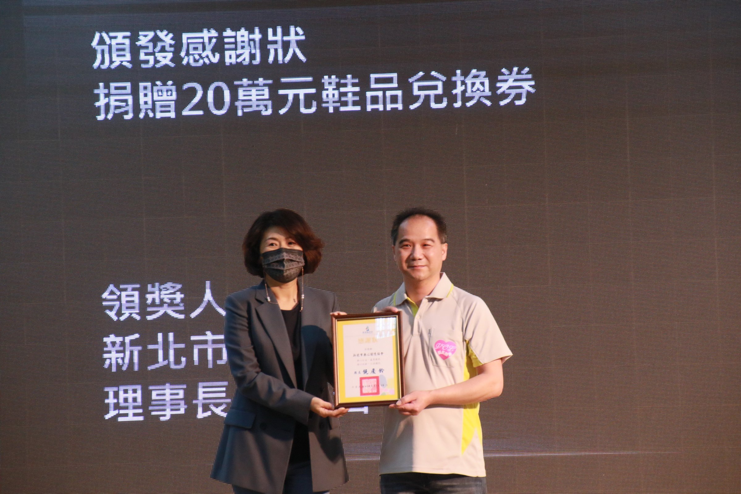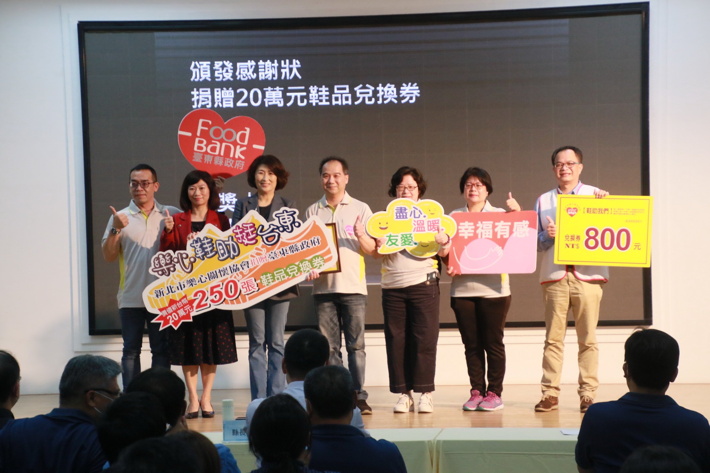 台東縣政府於今(18)日在縣府大禮堂辦理「樂心鞋助挺台東」捐贈儀式,由新北市樂心關懷協會理事長林陽晉捐贈面值新台幣800元鞋品兌換券共250張給台東縣政府,縣長饒慶鈴親自受贈並致贈感謝狀,饒縣長感謝新北市樂心關懷協會連續二年捐贈台東縣政府鞋品兌換券扶助弱勢家庭,讓學童挑選自己喜愛的鞋,大大減輕弱勢家庭幫孩子購鞋負擔,場面相當溫馨。