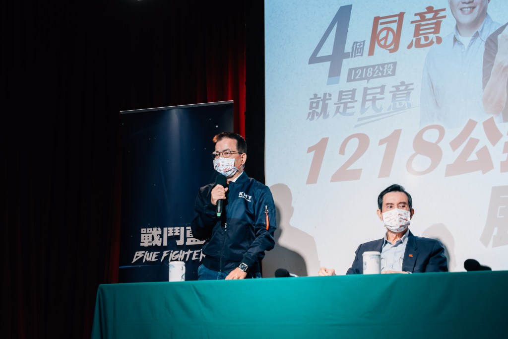 前國民黨主席、台北市長郝龍斌說戰鬥藍不是口號,戰鬥藍就是要戰鬥,今天就是我們戰鬥藍開始戰鬥的日子。同時再次強調,四個公投我們通通都是同意,沒有任何質疑。並且說這四個公投案當初是民進黨所主張的,如,反萊豬進口、珍愛藻礁、公投綁大選,今天換了位置換了腦袋,不只這樣,民進黨還汙名化公投,說這是國民黨來亂的、為了搶奪政權的。所以1218全民都要去投票,展現人民作主的決心,決不是讓政客昨是今非,讓民進黨的惡意破壞民主。