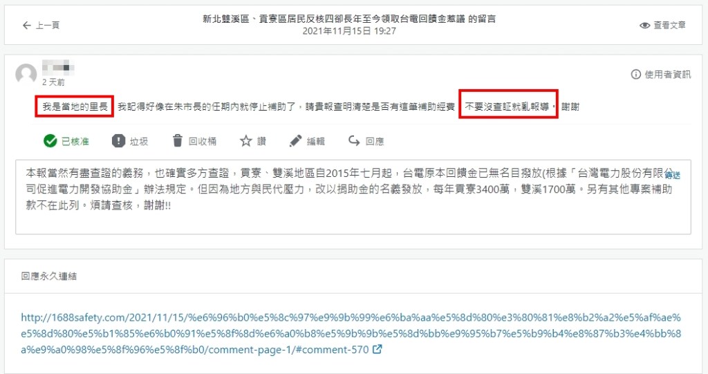 本報刊出後,收到一位自稱當地里長吳先生的回應,聲稱於朱市長任內已停止發放回饋金,並指責本報不該未經查證而「亂報導」。本報對於所有讀者的回應都相當尊重,於是再回頭查詢台電官網與網路登載的新聞資料,赫然發現無論是台電的資料以及網路多年以來的相關報導都被刻意隱藏或下架。