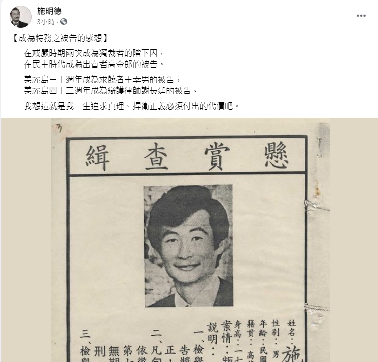 施明德並且列出他從事民主運動以來被告的歷程,以及這次被【謝長廷特務被告的感想】: 在戒嚴時期兩次成為獨裁者的階下囚, 在民主時代成為出賣者高金郎的被告。 美麗島三十週年成為求饒者王幸男的被告, 美麗島四十二週年成為辯護律師謝長廷的被告。 我想這就是我一生追求真理、捍衛正義必須付出的代價吧。