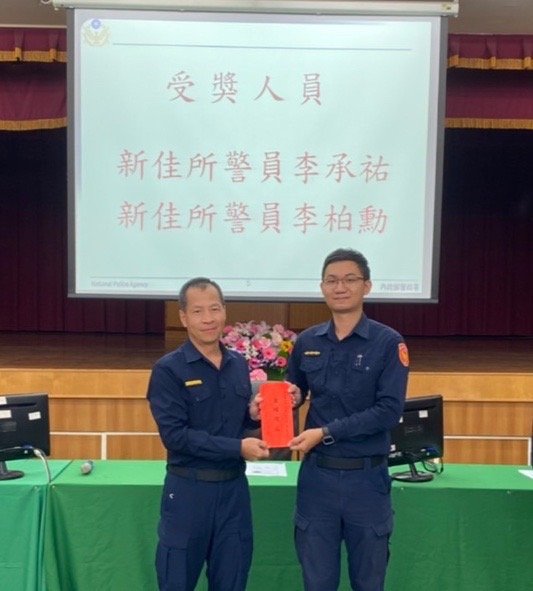 南投分局除了在分局門口張貼紅榜恭賀2位員警金榜題名外,分局長潘仕能也特別利用23日聯合勤教的機會,頒贈獎勵金向2名同仁道賀,2員也親自到場接受分局同仁的祝賀,其中警員李承祐的父親正好是南投分局副分局長李政昌,因此特別由李副分局長親自頒贈獎勵金給李承祐,讓父子同框分享彼此的喜悅,可謂是真正的傳承!