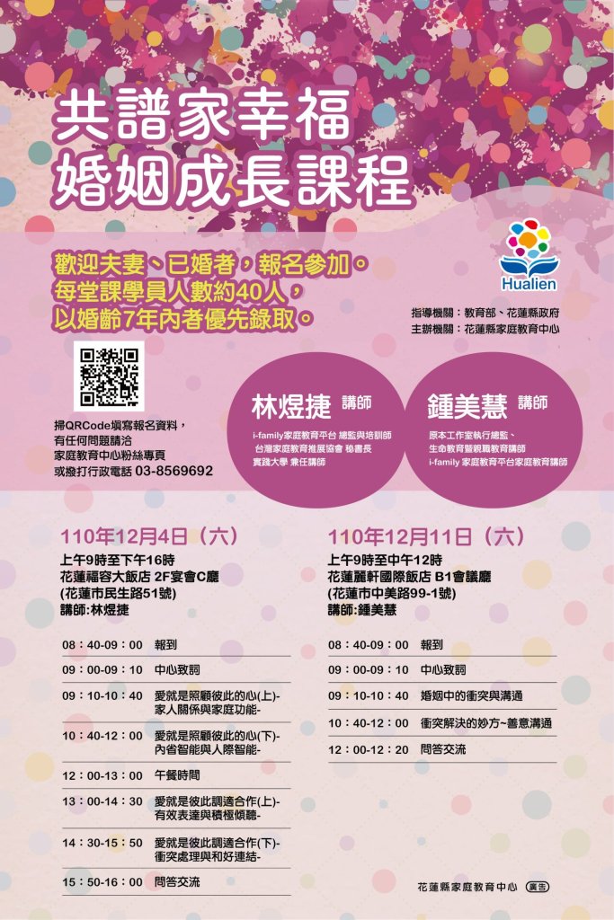 因應現代社會離婚率居高不下的現象,花蓮縣家庭教育中心辦理「共譜家幸福」婚姻成長課程。希望藉由本課程,幫助學員翻轉配偶間的刻板印象、學習家務分工、如何與姻親相處等婚姻生活中常見的議題;透過課程讓學員更瞭解自己與另一半,學習在家庭、婚姻關係中調整與適應,增進家人關係。