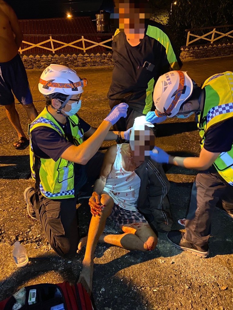 和平派出所所長王祝光、郭詠翰獲報民宅前有民眾跌倒後,隨即趕赴現場,一到現場後發現該男子頭部大量出血,趕緊與消防隊、和仁交通分隊救護及包紮男子傷口,並合力將傷患抬上救護車送醫救護,所幸該男子第一時間被發現,經緊急就醫後並無生命危險,若晚一點送醫治療,後果不堪設想,該意外經警方了解是因男子在民宅前空地類似梯田上方處飲酒時,不慎因所坐的椅子騰空,以致整個人由上方摔落在高約150公分的梯田下方,由頭部直接著地撞擊,導致頭部溢出大量鮮血,在場親友非常感謝警方及救護人員的協助,救回家人一命。