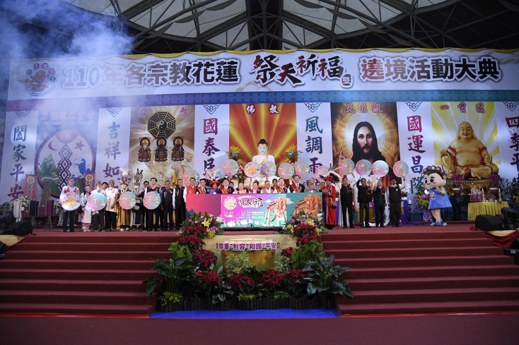 花蓮縣辦理各宗教祭天祈福暨全縣遶境活動,今年邁入第12個年頭,今(27)日於縣立體育館小巨蛋開幕,縣長徐榛蔚偕同花蓮縣佛教會釋地皎長老尼、聖南宮主任委員吳建志、財團法人天主教會花蓮教區副主教陳春光、太巴塱部落祭司林正治、花蓮縣一貫道協會理事長陳民等各宗教界代表及全國各地信眾教友,齊聚一堂,虔誠祈求上蒼庇祐花蓮縣運昌隆,人民安居樂業,場面莊嚴隆重。