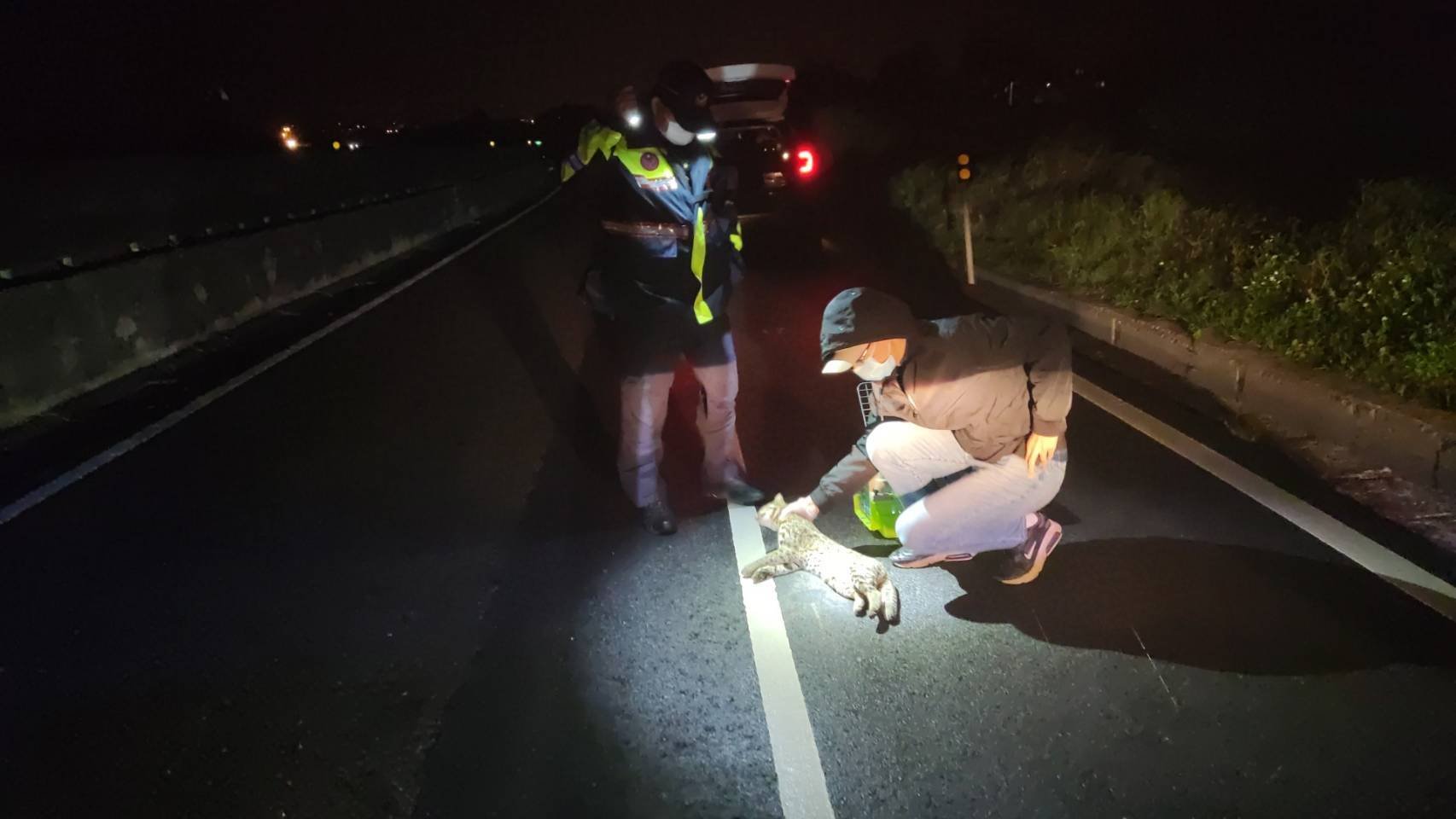 竹南警察分局大山派出所於110年11月26日晚間,接獲民眾報案稱發生交通事故,員警到場發現有2名機車騎士受傷及一隻石虎死亡,趕緊通知消防分隊救護車及苗栗縣政府農業處自然生態保育科派員協助。