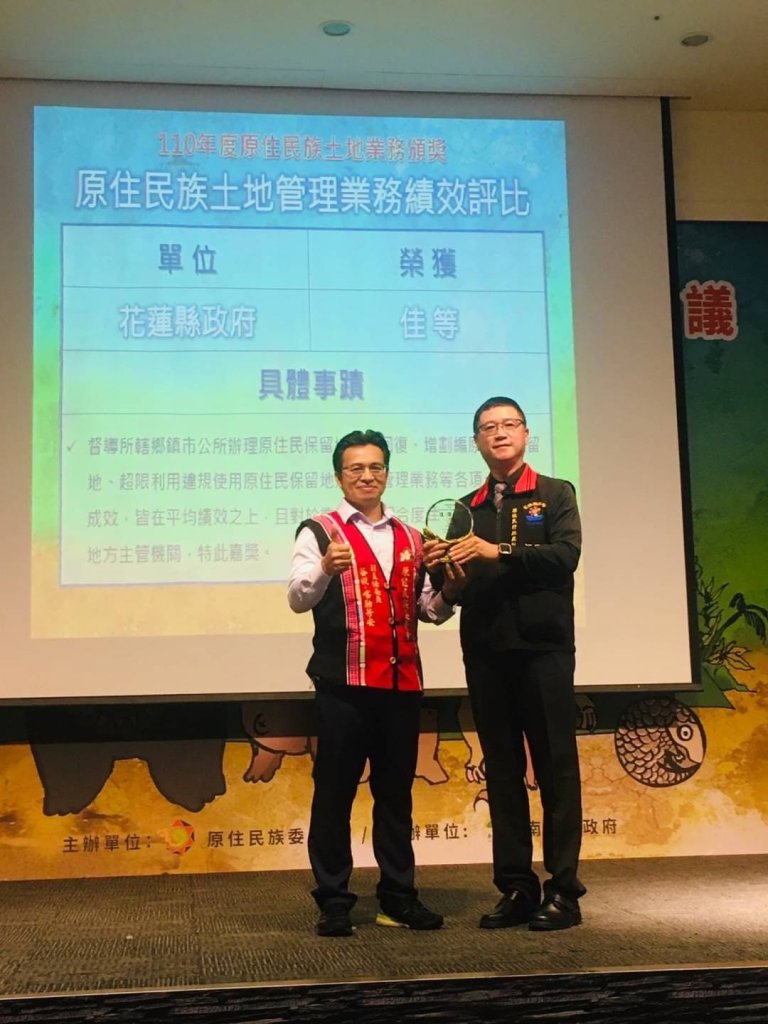 原住民族委員會於11月29日舉辦「全國原住民族土地業務年終檢討」會議,由原民會副主任委員谷縱.喀勒芳安親自到場主持,並頒發表揚110年度辦理原住民族土地業務成效績優的直轄市(縣、市)政府及鄉(鎮、市、區)公所;花蓮縣政府榮獲「整體原住民保留地業務績效評比佳等獎」,也就是全國第三名,另花蓮縣獲獎公所,則有玉里鎮公所、瑞穗鄉公所及壽豐鄉公所分別獲得「原住民保留地增劃編業務特優獎、優良獎及佳等獎」,玉里鎮蔡秋龍鎮長及瑞穗鄉陳進光鄉長也都出席領獎。