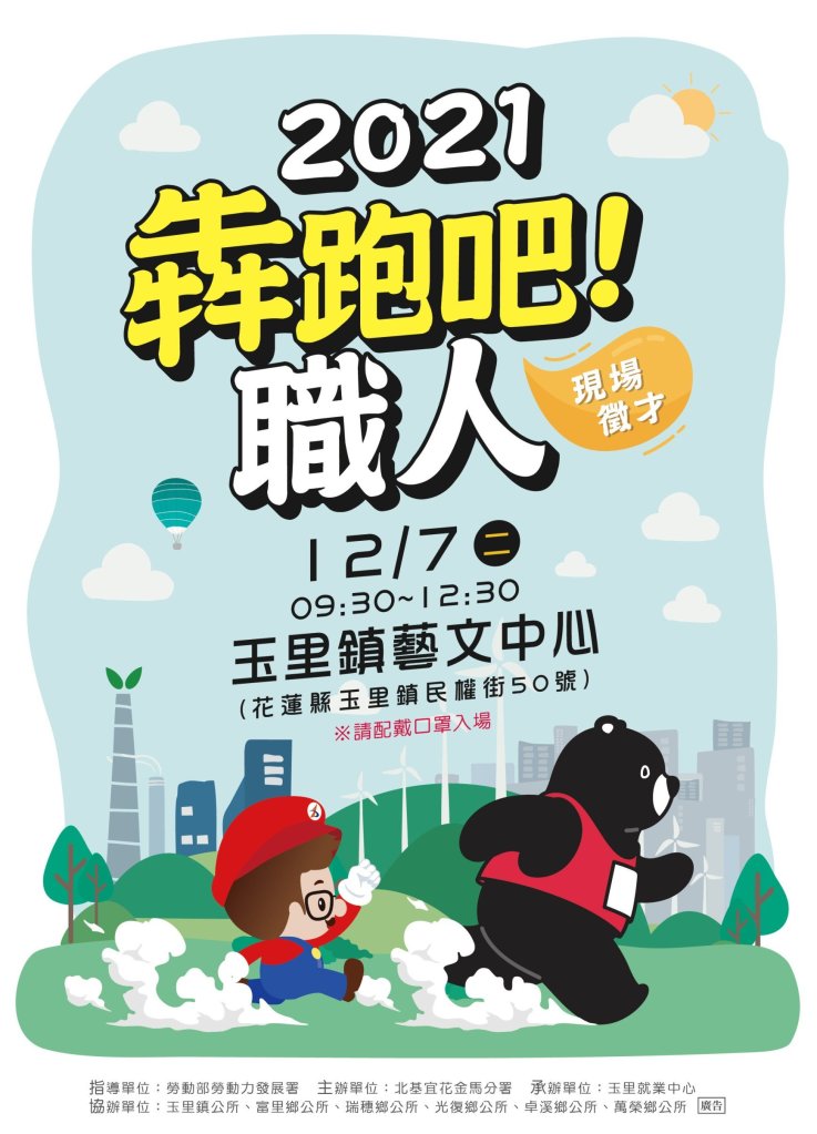 隨著疫情趨緩,為提供花蓮南區待業、轉職之鄉親有更多的工作機會,並落實在地就業服務,補實廠商缺工需求,勞動部勞動力發展署北分署玉里就業中心將於12月7日(星期二)上午9時30分至12時30分於玉里鎮藝文中心舉辦「2021犇跑吧!職人-現場徵才活動暨多元方案社區成果展示」,有15家在地廠商,釋出107名職缺,歡迎待業民眾把握機會,踴躍到場求職!