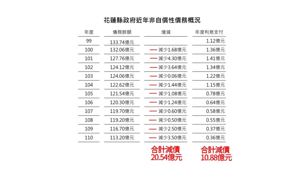 花蓮縣政府再三強調,從87年凍省後至98年間,花蓮縣政府年年累進增加負債10多億元,至99年縣長傅崐萁就任時,縣庫赤字負擔133億已達舉債上限,既不能再舉債,還要想方設法還債並支付利息,財政艱困為歷屆縣長之最。自前縣長傅崐萁至現任縣長徐榛蔚扛起持家重擔,已經連續11年減債、還債20.54億元,並支付利息10.88億元,同時建設花蓮縣各項建設為五星満意度的縣政成果。