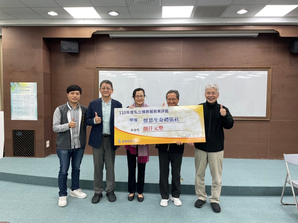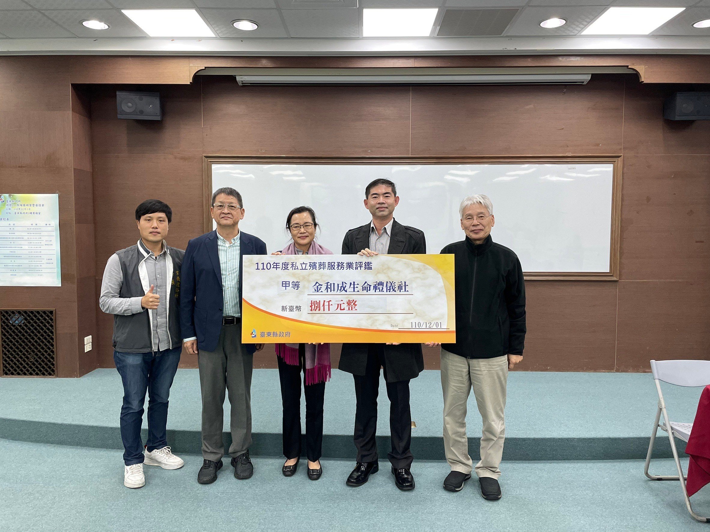 為提升台東縣內殯葬服務業者服務品質,臺東縣政府民政處辦理殯葬服務業評鑑,邀請國內殯葬服務實務界及學界權威邱達能及譚維信兩位學者專家擔任評鑑,今110年度計有信誠葬儀社、東欣生命禮儀社、懷恩生命禮儀社及金和成生命禮儀社4家優秀業者獲獎,並於日前舉行110年殯葬服務業研習中接受表揚,由民政處副處長歐斐君頒贈獎金8000元及表揚狀。