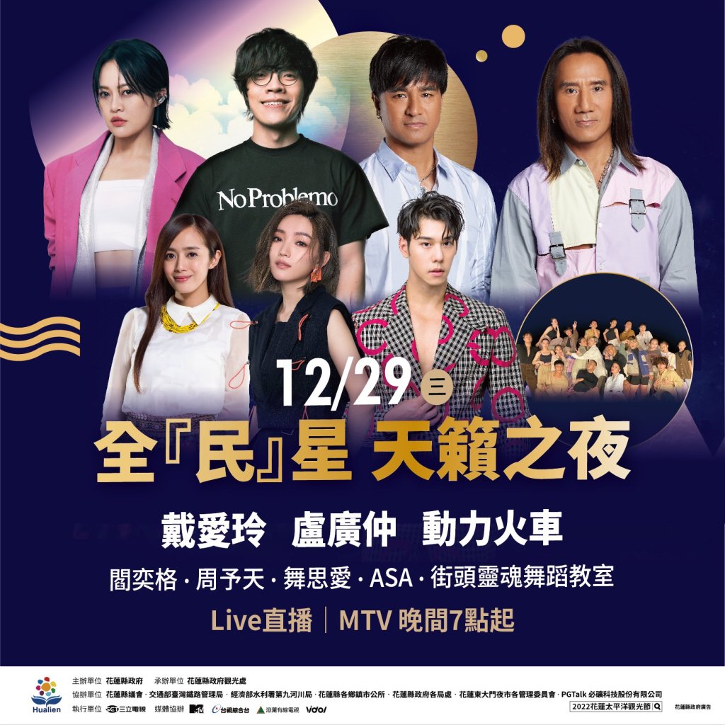 觀光處長張志翔指出,今年花蓮太平洋觀光節是全台最長、組數最多、含金量最高的跨年演唱會,囊括金鐘、金曲、金馬和金音獎得主,且每天安排雙壓軸卡司及主題之夜;12月29日「全『民』星天籟之夜」將由天團動力火車及鐵肺天后戴愛玲領銜,帶來原住民的獨特魅力,並由最年輕的三金得主盧廣仲壓軸演出,透露演出歌單將會帶來新專輯的『勵志論』,希望來花蓮跨年的所有人都跟著他一起跳!