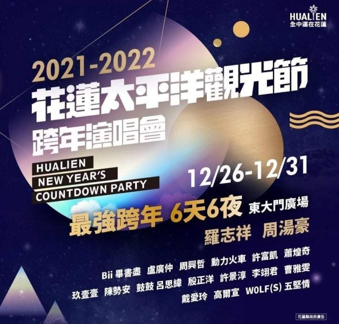 花蓮縣政府舉辦「2021-2022花蓮太平洋觀光節跨年演唱會」,將於12月26日到31日連續六天在花蓮東大門廣場熱鬧開唱,繼上週公布前三日主題,今14日再公布29日「全『民』星天籟之夜」及30日「音浪來襲美聲之夜」主題夜,將由盧廣仲、動力火車、周興哲、蕭煌奇等重量級巨星擔任壓軸,讓花蓮東大門廣場星光熠熠!
