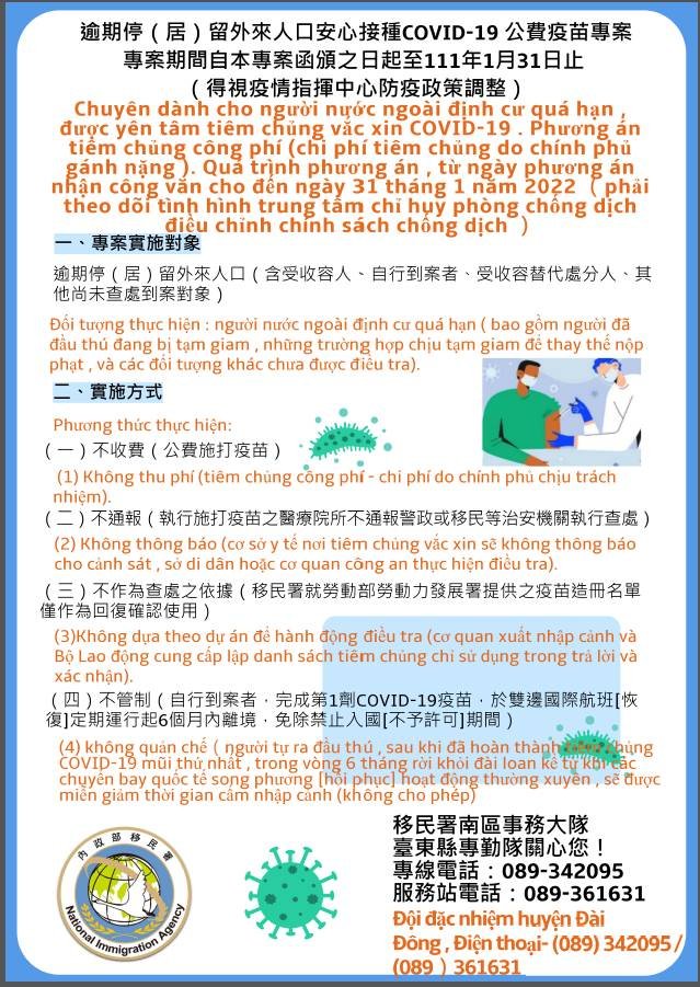 臺東縣專勤隊及服務站為擴大宣傳專案措施,連日來前往東南亞商店及餐廳等處所宣導,並拜訪最熟悉社區大小事的村里長,說明逾期外來人口絕對不會因為接種疫苗而被查處,而且不會收取任何費用,請大家一起用力向生活周遭的外國朋友們告知這個消息,請他們趕快到臺東縣各鄉鎮衛生所接種疫苗,也可以先向移民署或「社團法人臺東縣外籍配偶協會」預約登記。
