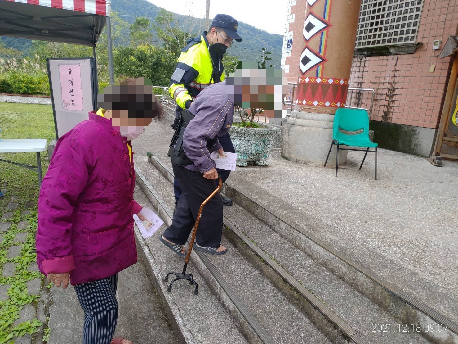另各投開票所員警擔任警衛人員遇見有年長者、行動不便之身障人士(輪椅、助行器、拐杖等)到場需要幫忙,員警均秉持人親己親的精神適時給予協助攙扶,使其顺利參與投票,也讓現場參與投票的民眾頻頻讚許員警熱心為民服務的精神。