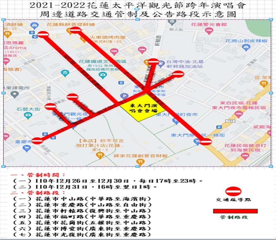 「2021花蓮太平洋觀光節」將於110年12月26日至111年1月1日止共計6日,在花蓮市東大門廣場隆重登場,依往年經驗,活動期間將吸引大批人潮湧入花蓮市區及活動會場,因此花蓮警分局除事先縝密規劃勤務外,並在6日的活動期間動員警民力做好交通疏導準備,請用路人配合警方疏導作為,共同維護人車安全及交通順暢。