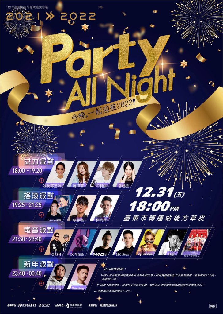 給你不一樣的歲末活動,臺東縣政府重量級歲末歡樂派對活動「Party All Night」12月31日(五)晚間18時起於臺東市轉運站後方草皮舉行歲末活動,總共四個不同主題、13組藝人要跟你一起迎接2022,臺東子弟MATZKA及Suming舒米恩壓軸演出,女力派對主題階段優惠前200名入場女性將有好禮贈送,請多多把握。同時目前也正是縣內卑南族辦理年祭祭典,縣長饒慶鈴歡迎全國鄉親跨年元旦連續假期安排到臺東一遊,歲末派對活動請上「臺東縣歲末系列活動」臉書粉絲專頁https://www.facebook.com/2014.taitung.party 查詢,活動資訊將隨時更新。