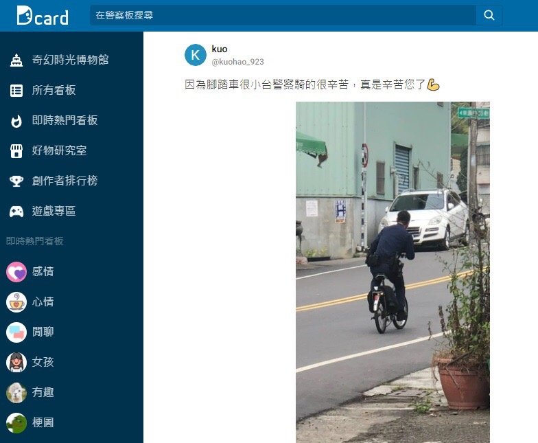 陳姓老翁應答不清楚,不知要去哪裡?員警發現所戴的帽子有寫上家屬電話,先將老翁帶回派出所休息,經電話聯繫後家屬希望警方幫忙代叫計程車返家。老翁自行騎乘一部自行車,巡邏車無法載送,熱心白姓員警將車騎回派出所,騎乘背影被民眾拍照PO上Dcard社群網路,冷冷的冬天看到這溫暖感人的背影,不少網友看到PO文紛紛大讚「警察真是辛苦了!」。