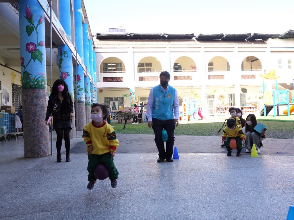 市長爸爸也和小朋友們一起體驗「運動我最棒」的關卡,是用雙腿夾球跳到終點後折返,有的小朋友輕鬆完成關卡,有的小朋友一跳,球就掉了,市長爸爸在一旁耐心的等著小朋友一起跳回終點,順利完成關卡。