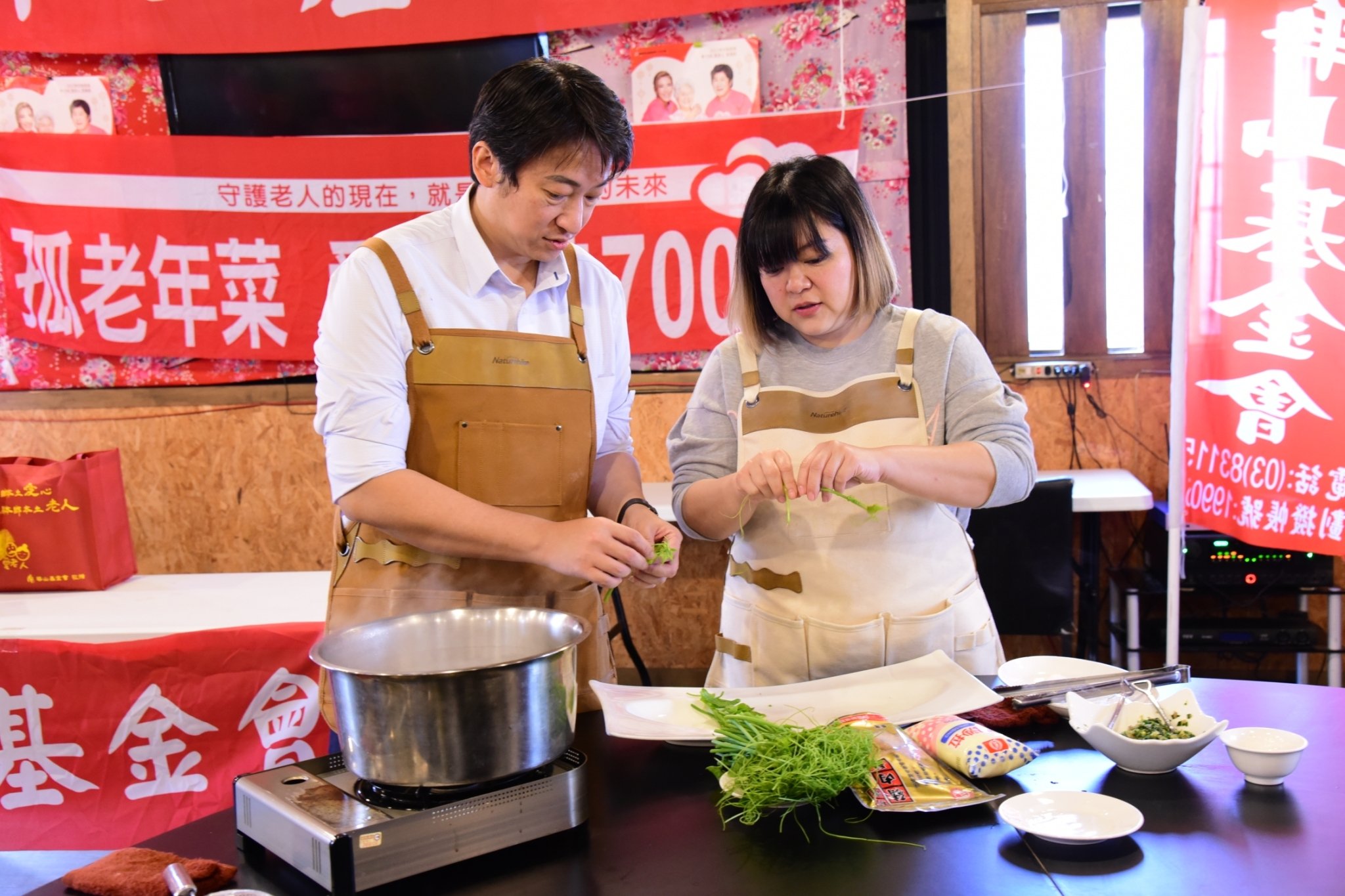 廚藝PK賽由魏市長與杜詩梅搭檔,以櫻花蝦搭韭菜做成水餃,並將龍鬚菜汆燙後佐沙拉及肉鬆酥,夯BAR老闆黃學文則料理麻油長壽麵線,以及運用香菇為主食的「好運菇腸報道」等,雙方以趣味競賽,做出幾道好吃料理,讓等在一旁的幾位老人家頻頻喊道「好香」。