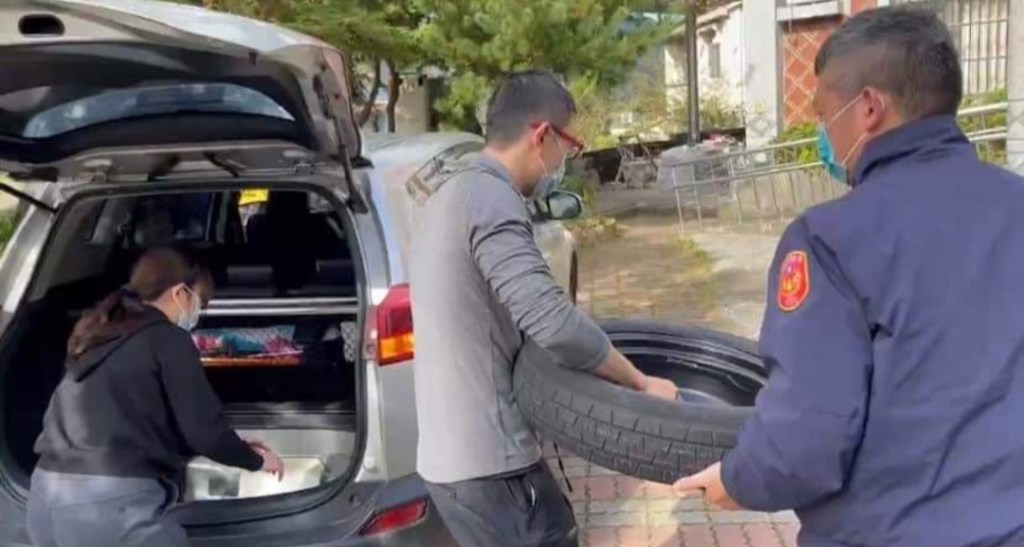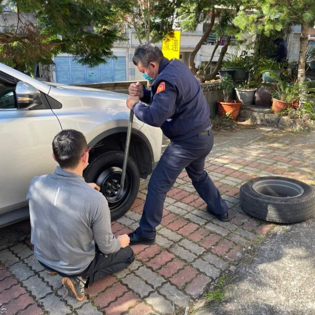 蓬萊派出所所長林振民以及副所長郭瀅麟立即出來查看車輛狀況,發現車輪爆胎須立即更換才得以安全行駛,故致電轄區各修理廠,惟適逢跨年連假期間修理廠均未營業,所長及副所長遂決定親自著手更換輪胎。在確定民眾車內備有千斤頂以及備胎後,便利用簡易工具將車輪螺帽轉鬆、放置千斤頂頂起車輛,再拆下輪胎裝上備胎,大致花費半小時即完成更換輪胎的動作,讓民眾得以開心出遊、平安返家。