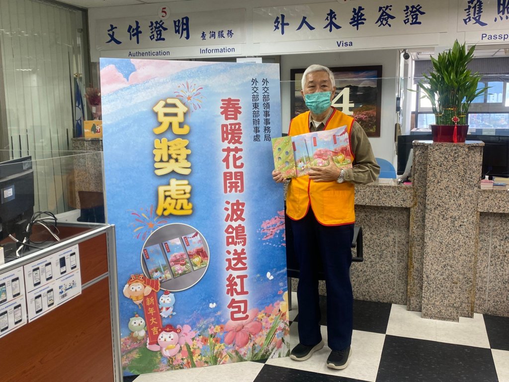 虎年春節假期即將來臨,外交部領事事務局提醒國人注意旅外安全,特舉辦「春暖花開波鴿賀歲」旅外安全宣導活動,民眾於1月10日到12日期間只要到外交部東部辦事處申辦護照、簽證或文件驗證並完成繳費,就可以憑繳費收據領取波鴿紅包禮盒,一人一份,數量有限送完為止。