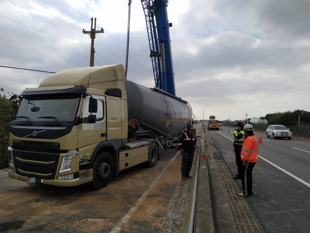 當時正值民眾上班時段,車流量大,警方立即調派交通快打警力共5員到場,先行運用交通錐等管制設施進行車流疏導、封閉北上側車道,聯繫公路總局第二區養護工程處派遣防撞車及事故處理班人員協助,並通知5輛大型吊車及1台起重機進行拖吊作業,員警於該處疏導交通近7個小時,直至14時30分許排除交通障礙後,重新開放側車道通行。