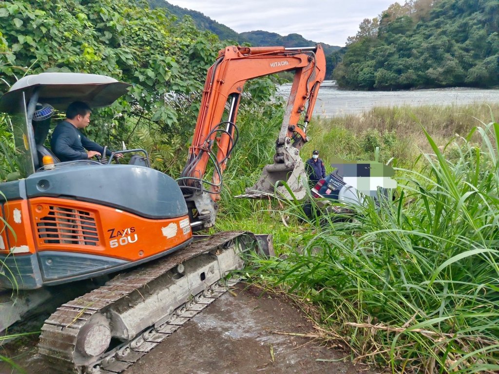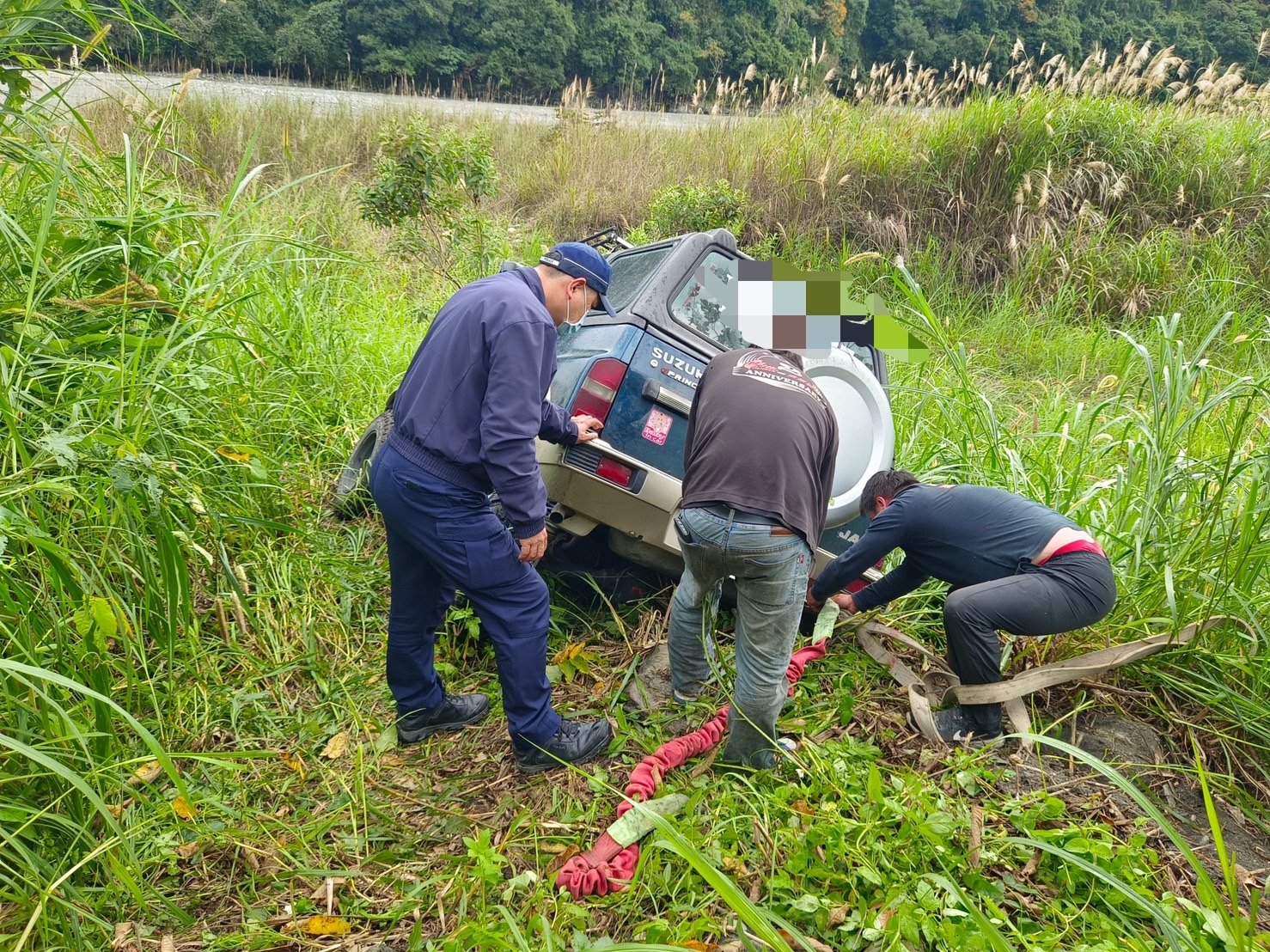 副所長林文雄表示,立即請村民駕駛貨車載運挖土機前來協助,先清除路面的雜草,開闢一條可供行駛道路,隨後2名員警與挖土機司機聯手將泥土墊在懸空的左後輪,形成可供車輪抓地的路;接著以繩索綁著吉普車右後輪,挖土機用挖斗以拉的方式,將吉普車扶正,再將繩索牢固的綁著後保桿,一步一步將吉普車拉回道路上,總共費時1個小時才順利解決這次危機。事後民眾不停感謝警察的熱心相助,並讚許警察真的是人民保母!