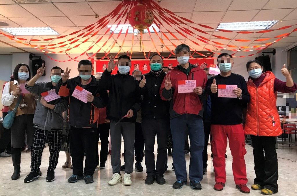 快過年了!因COVID-19防疫關係,多數住民選擇在機構過年,該院趙建剛院長特別來電拜年:「祝福大家工作訓練順利、年年有進步、天天都開心、穩定」。自治委員會為了住民有機會享受年節氛圍,特別安排大家相聚時刻,溫馨犒賞全體住民、歡樂、辭舊歲,期待來年訓練工作更為順遂,最後祝福大家吉年新氣象、好運年年有、今年錢多多。