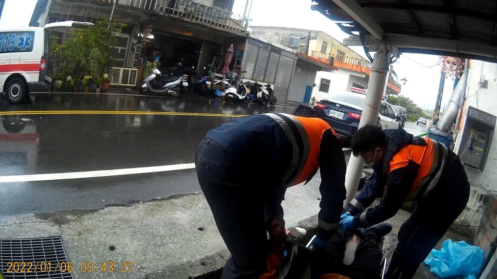 鳳林警分局港口派出所所長彭張政雄於日前上午8時至10時執行巡邏勤務,行經靜埔村公車站旁,員警發現有一名老翁穿著雨衣坐在地上,於是上前關心老翁狀況,經了解該老翁為靜浦村居民,當天一直飄著雨,老翁穿著薄外套外加雨衣欲搭公車到豐濱醫院看病,於是在公車站牌等候客運車,員警見該老翁全身濕透坐在路旁不斷發抖,立即攙扶至站牌旁房子屋簷下避雨;老翁經大雨淋溼後身體出現不適頻頻喊冷,員警立即通報救護車緊急與救護人員將老翁送至豐濱醫院治療,家屬對於警方積極熱心協助頻頻道謝。