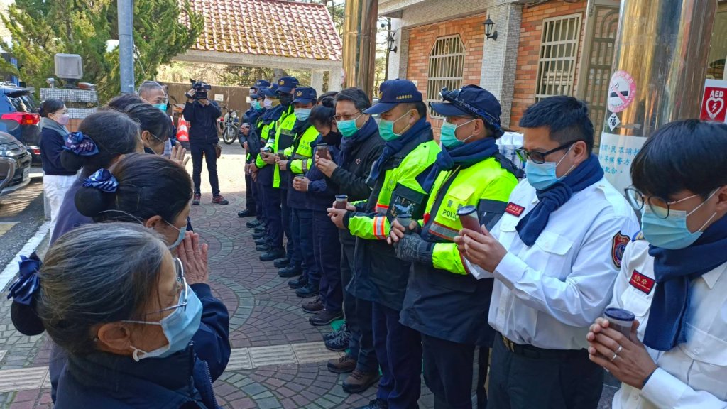 為體恤高山執勤員警的辛勞,約20餘人的花蓮慈濟志工於今日帶著圍巾、香積麵、福慧珍粥、水果、暖暖包、大補湯等愛心物資,前往天祥、合歡派出所,並將手做的大型Q版警察卡片贈予警方,裡頭寫著滿滿感謝的話,讓員警深感溫暖。