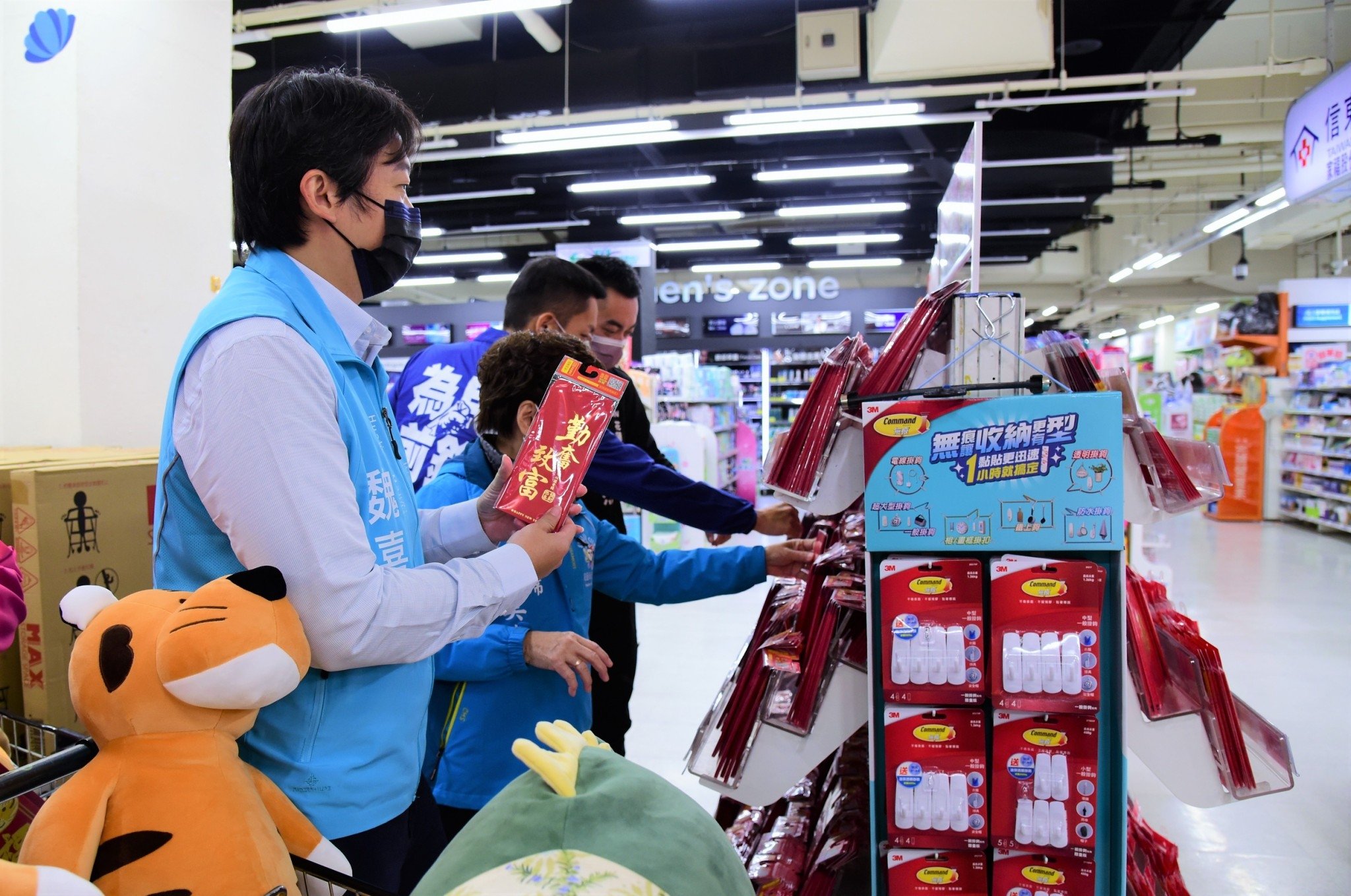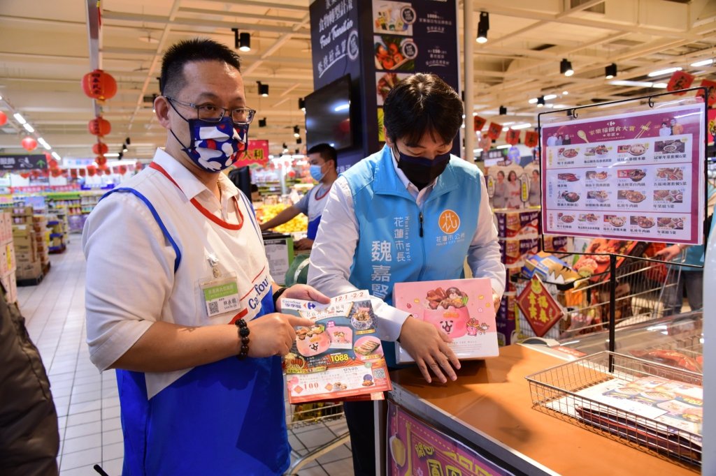 在家樂福賣場,魏嘉賢等人推著掛有「虎年送暖」、「幸福寅春」吉祥招牌的採買車逛量販店,推車裡有應景年節的糖果、餅乾之外,還有衛生紙、白米、泡麵等生活用品。魏嘉賢感謝熱心人士、企業及社團捐款給市公所慈愛基金,以及愛花蓮愛心文化藝術基金會,市公所特地購買愛心禮券,讓低收入戶及中低收入戶的家庭可以購買應景的物品。