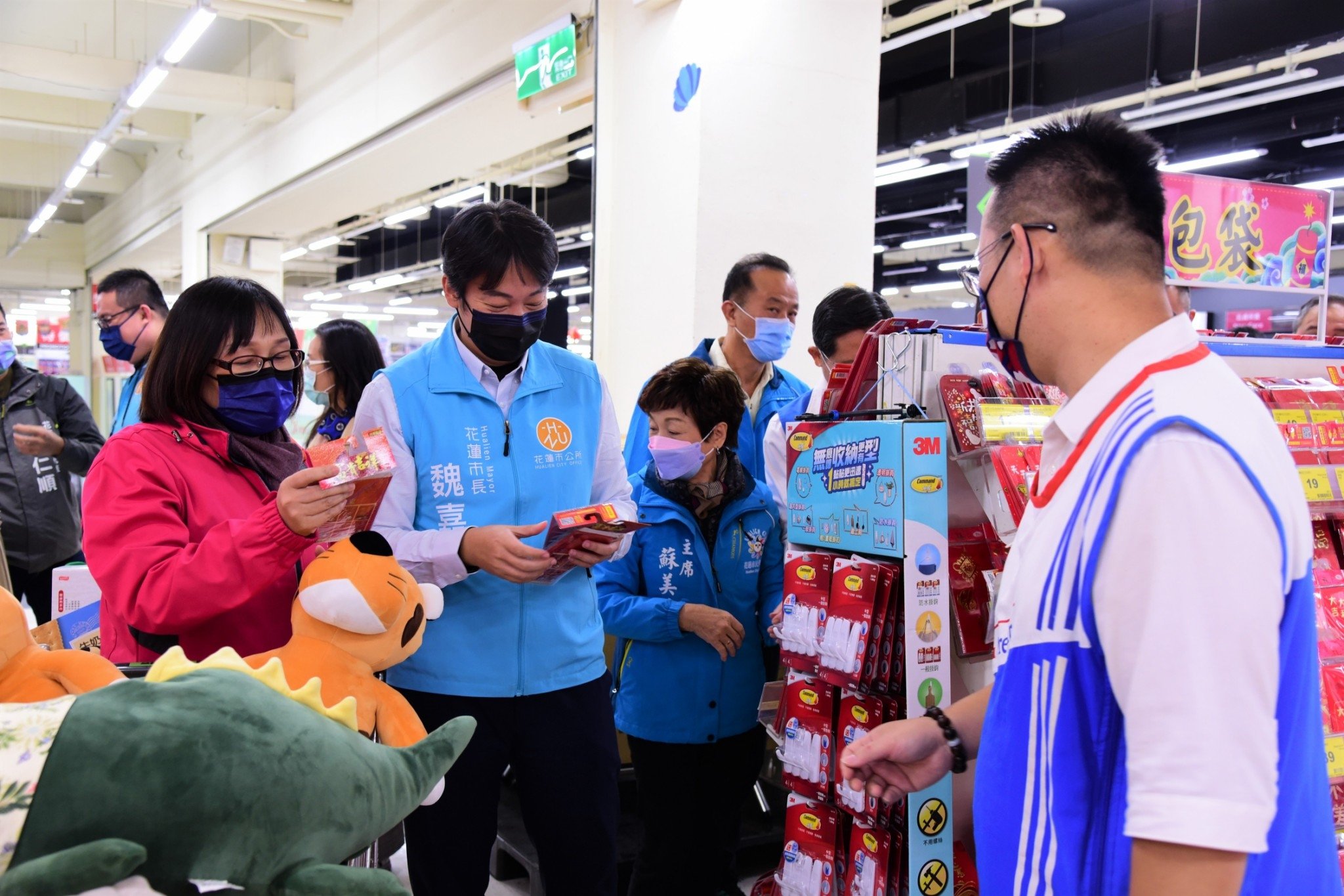為讓收到愛心禮券的市民朋友了解如何持禮券採購,魏嘉賢市長今天(14日)上午偕同主任秘書翁美華、社勞課長蕭子蔚等人前往家樂福量販花蓮店,由食品處經理林永明以及安全經理陳光正陪同一起採買教戰。偕同一起還包括花蓮市民代表會主席蘇美珠、副主席李振瑋,以及江如玲、胡仁順、蔡翼鍾、謝豪杰、林百瑞、蕭民隆、平島•部定等多位市民代表,他們對於市公所這項放寬領取標準讓更多弱勢家庭可以受惠的社福政策給予高度肯定。