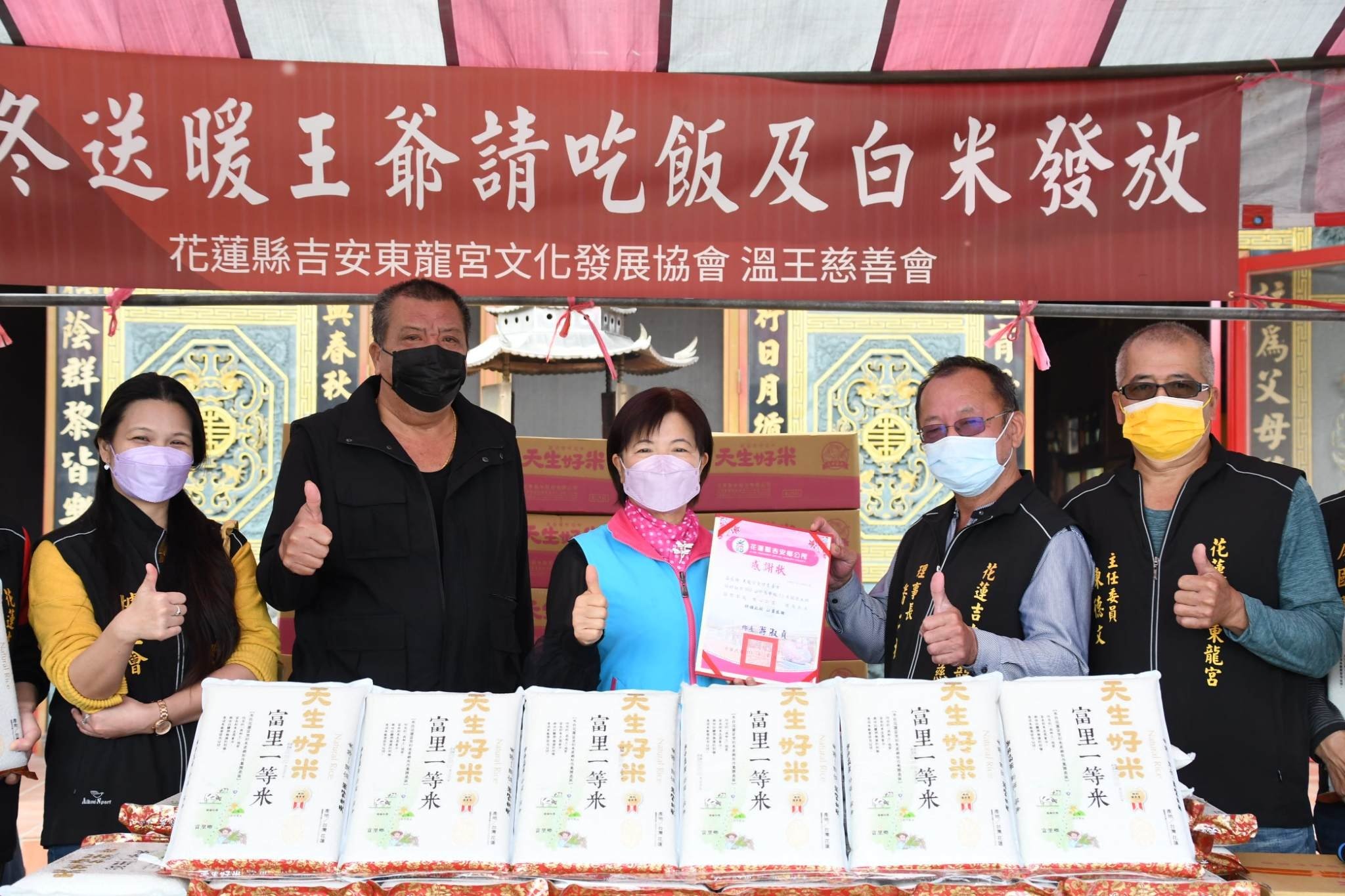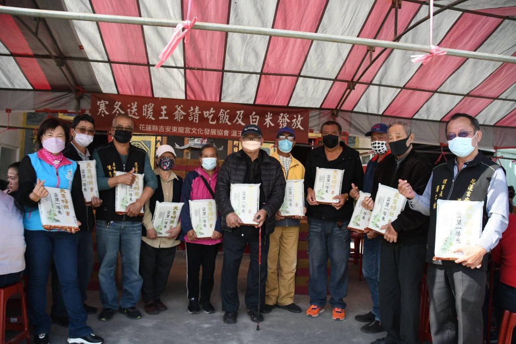 東龍宮宮主黃金波、主委陳德文及溫王慈善會理事長潘仁松共同表示,東龍宮跟著游淑貞鄉長的善心腳步深入部落、走入基層關懷服務,致力社會公益、關心弱勢從不間斷。他肯定游鄉長從過去擔任吉安鄉代及議員期間,百次深入基層陪同東龍宮參與社會救助,大家分工隨行將萬斤白米載往全縣偏鄉學校及弱勢民眾家中,歷年也由她串連各村鄰社區籌辦「愛心平安關懷餐」,今年配合防疫規定做實名制管理,特安排來廟埕吃平安,在溫府王爺的慈悲傳愛下,盼每位用餐的人獲得慰藉並祝來年健康圓滿。