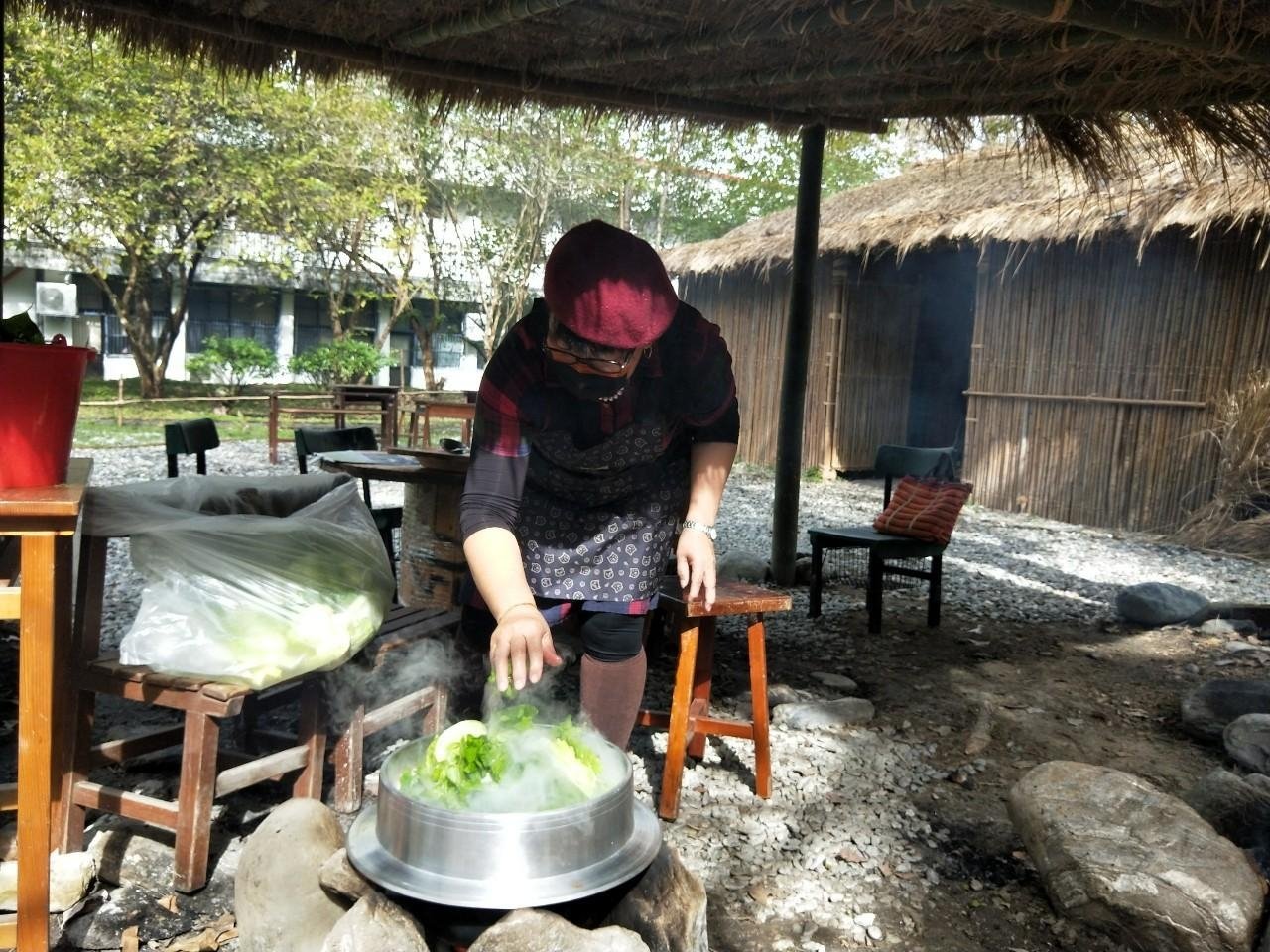 午餐時間,觀音國小採摘傳統家屋前師生共同耕種的野菜,烹煮成一大鍋阿美族傳統風味的野菜湯,提供兩校師生共同享用,在歡樂中進行一場野菜文化美食饗宴。