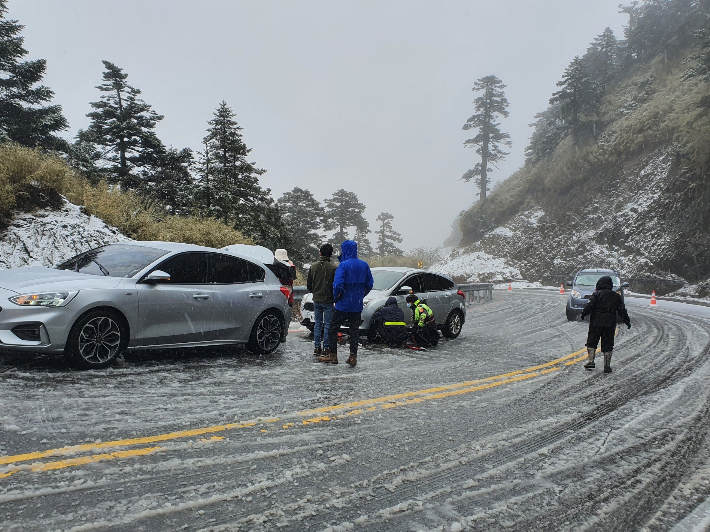 合歡所警員呂小平、賴彼得到達松雪樓後,看見已有許多遊客正在加裝雪鏈,並七嘴八舌地向員警報稱:有許多車輛困在水晶宮路段(南投轄區)內,動彈不得,亟需協助,2警獲報後立即帶同山警小隊長蘇祺昌前往排除。