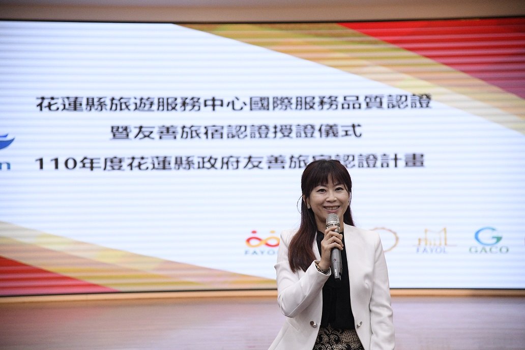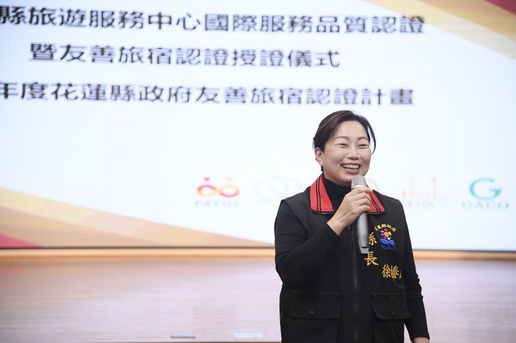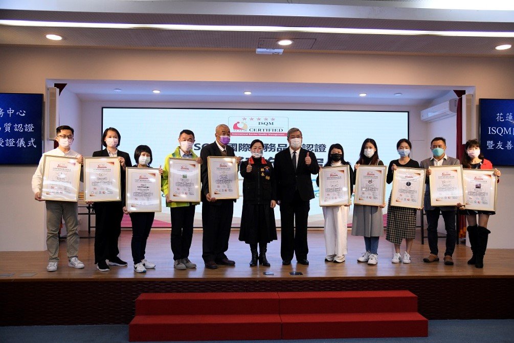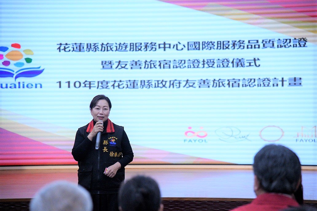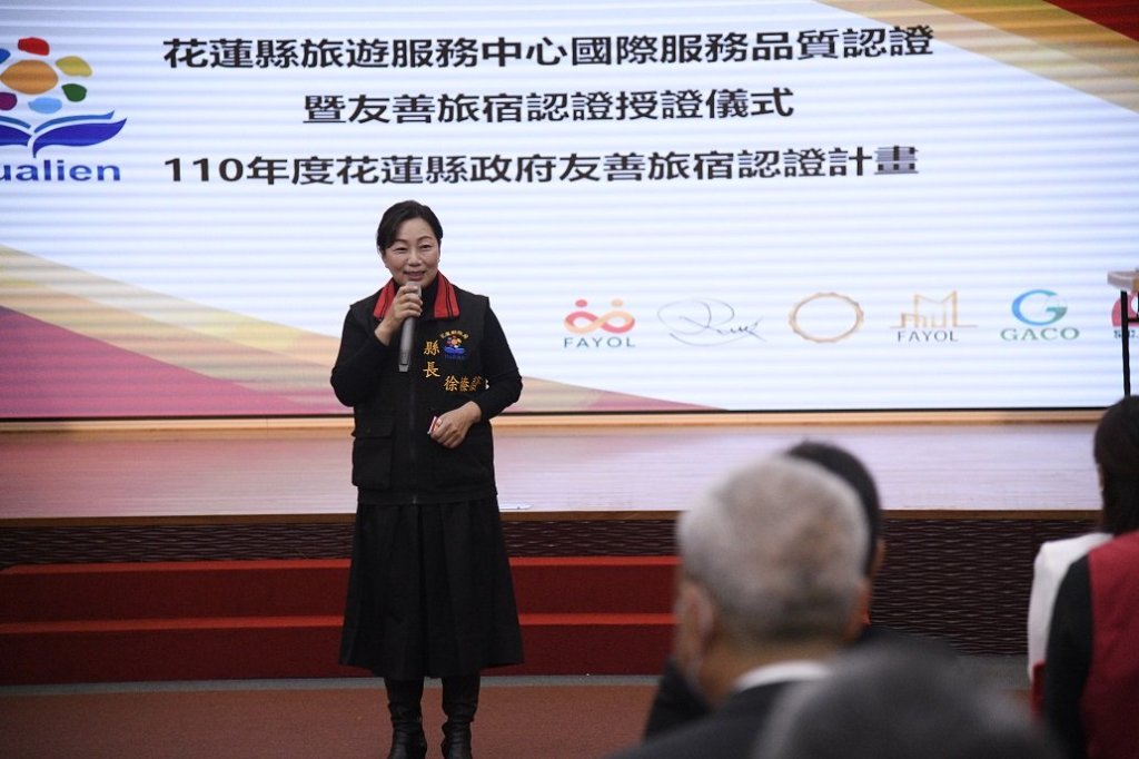 花蓮縣政府觀光處自110年首度推動「友善旅宿認證計畫」,由花蓮縣旅遊服務中心及10家旅宿業進行「ISQM國際服務品質認證」、「FTH友善運動賽事旅宿認證」、「KLS親善Long Stay旅宿認證」及「ISFE高齡親善環境認證」等四項認證之培訓,經過為期數月的輔導與稽核,審核結果於今年1月初揭曉,共計取得25張證書的佳績;其中花蓮縣旅遊服務中心更是全台第一間通過ISQM國際服務品質認證的旅遊服務中心,認證授證儀式昨(20)日於花蓮縣政府大禮堂舉行,由徐榛蔚縣長與法約爾國際認證機構董事長王孝慈共同授證。