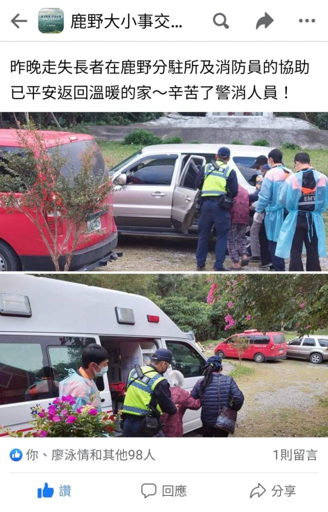 臺東縣警察局關山分局鹿野分駐所於日前(19)日晚間22時15分許受理林姓阿嬤(32年次)協尋人口案,所長徐俊煜發動所內同仁,並通報各分駐(派出)所協助找尋,但均找尋無果;於昨(20)日16時16分,警員吳文彥處理一件路倒事故,經比對路倒阿嬤居然就是被協尋人,員警握著阿嬤的手安撫,等候家屬及消防救護人員抵達;所幸經診療無大礙,由家屬平安帶回;民眾也在「鹿野大小事交流團」PO上找到阿嬤文,除報平安外,同時也感謝警消的協助。