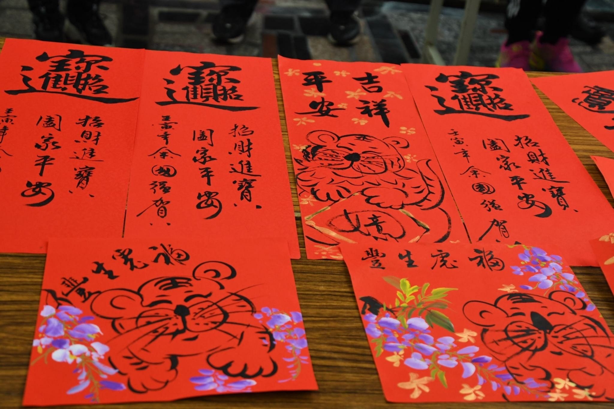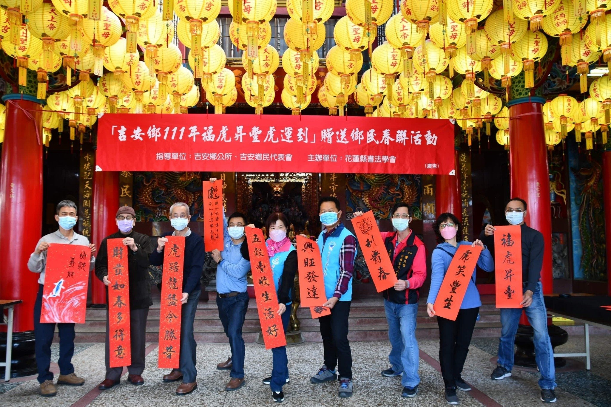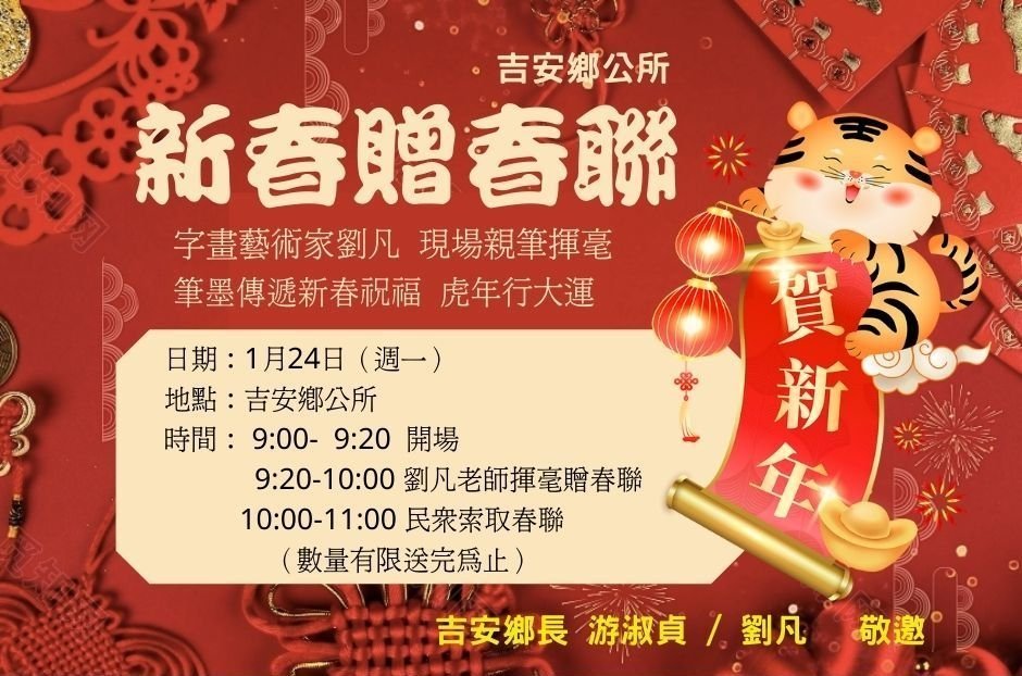 吉安鄉公所聯辦八場幸福揮毫贈春聯活動 ,場場爆滿、鄉親指定語詞、現場姓名創詞春聯、各宗教祝禱吉祥話、百業吉祥話…多元羅列其中,名師也使出渾身解術,完成鄉親滿意需求。活動人潮絡繹不絕的好客廣場,吸引上千名鄉親遵守防疫距離踴躍索取年味手寫春聯,鄉長游淑貞也化身「送福天使」致贈超人氣「福虎躍吉安」Q版春聯,為民眾添好運、送祝福。