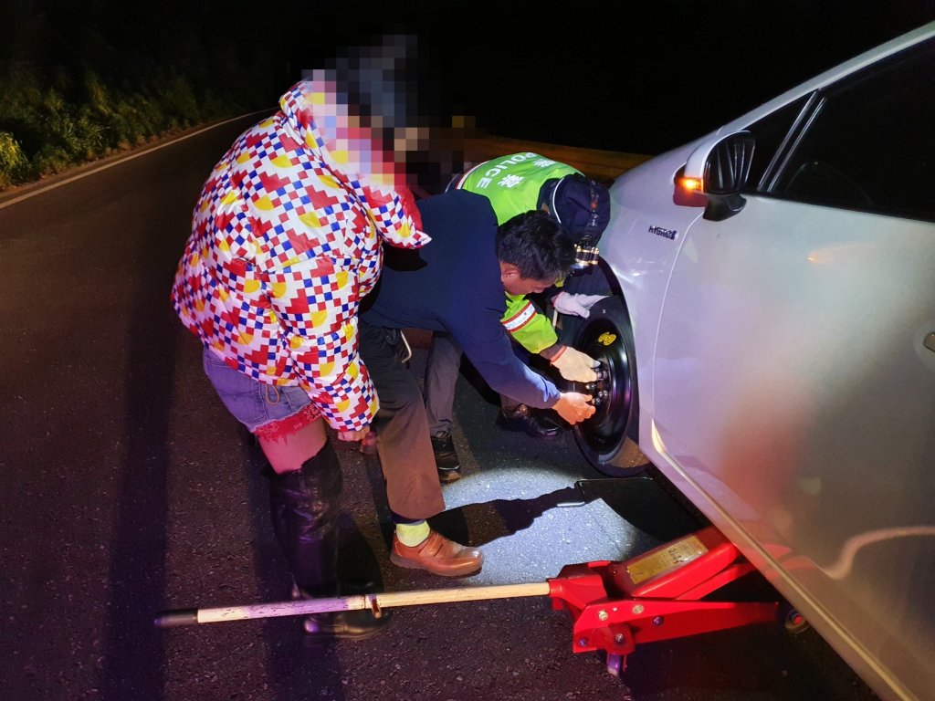 當員警遠赴19公里之山路後,終於看見路邊有一部拋錨車輛,只見1名娉婷嬝娜的女子站在路邊發愁,旁邊正有另1名見義勇為的路人正奮力地幫她頂起車體,經員警下車詢問,得知原來是蘇姓女子因車輛左前輪軋到釘子而爆胎,單獨一人之蘇女無力換胎,只好報警求助,在警方到場前,正好路過之好心人發現,遂上前協助。