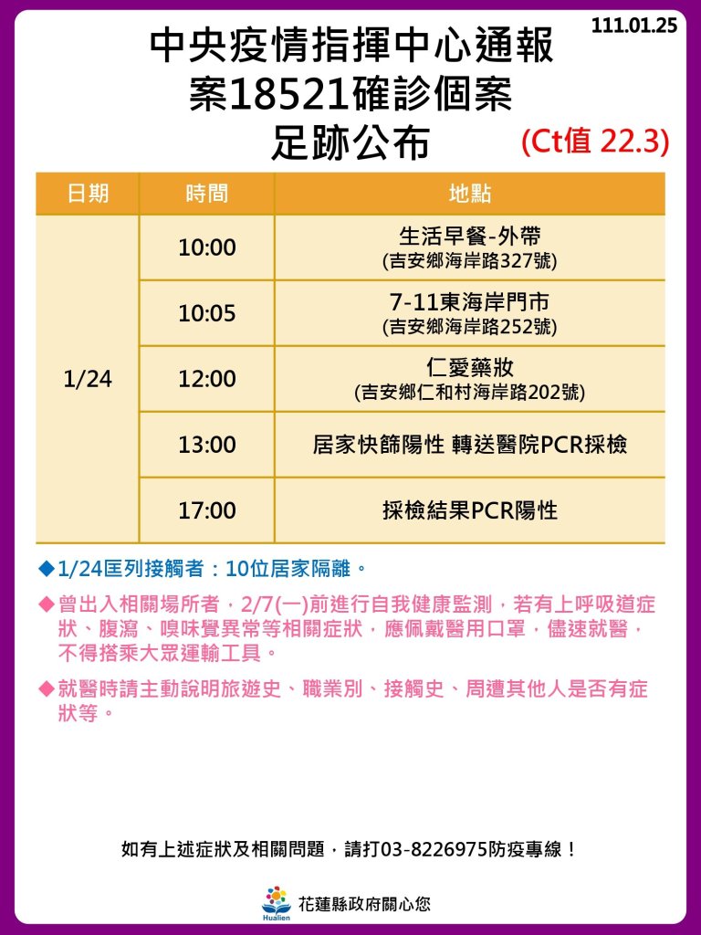 花蓮縣衛生局今天召開疫情說明會指出,案18521居住及工作地在桃園,與宜蘭礁溪員工確診案(案18495)有接觸,1月23日回花蓮爺爺、奶奶家,幫忙過年前整理家裡,得知朋友確診後自行居家快篩陽,1月24日中午自行購買居家快篩試劑,結果為陽性,經花蓮縣政府衛生局轉介至醫院進行PCR採檢,結果陽性(CT值22.3),經安排後收住醫院隔離治療。