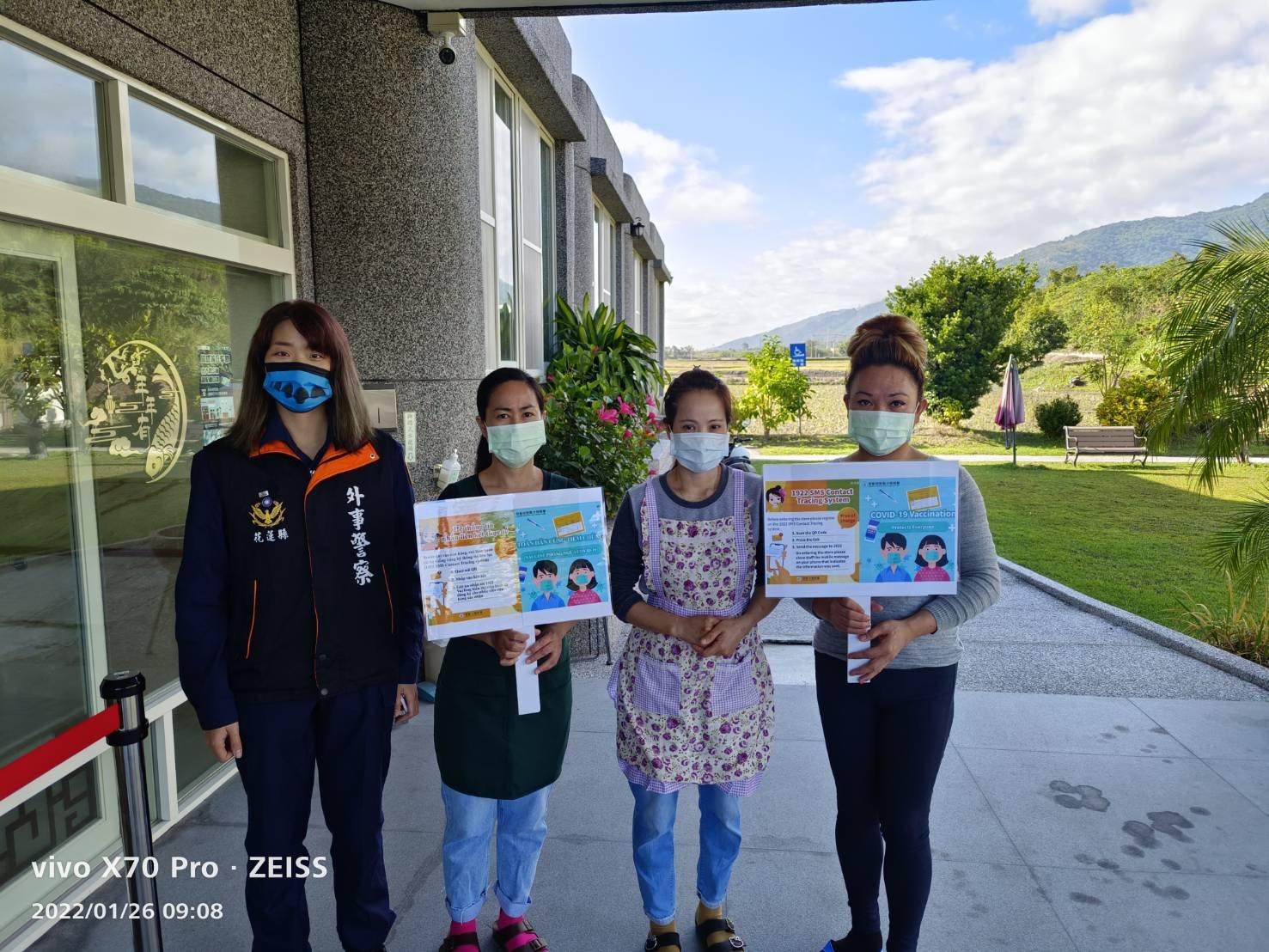 三組組長林國銘進一步說明,花蓮縣政府警察局玉里分局轄內居留外僑計有450人,其中以印尼籍家庭監護工為最大宗;越南籍移工皆已接種第三劑疫苗,由於新型Omicron病毒傳播力強,為避免移工因為群聚而導致疫情擴散,配合中央疫情指揮中心及花蓮縣政府所公布的各項防疫資訊,以「移工母語」透過跨國勞動力權益維護網站、LINE@移點通、臉書等多元宣導管道,向移工、雇主宣導包括宿舍防疫指引、疫苗預約方式及施打地點、簡訊實聯制等重要資訊,透過自己最熟悉的語言管道加上多種社群網站了解最新防疫資訊。